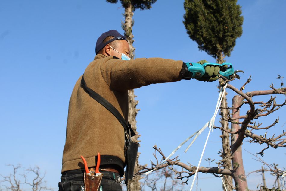 走进基地,沿山坡望去,一排排果树树形规整、层次分明。果农们手持电动气压剪穿梭林间,精准修剪枝条,切口平整光滑。“我们重点剪除把门枝、过密枝、病虫枝和枝林比不合理的枝条,改善果树通风透光条件,促进养分集中供给,为明年增产丰收打好基础。”花牛镇农艺师安谋生一边指导工人操作,一边介绍道。相较于传统手工修剪,电动气压剪的全面普及实现了“提质增效”双重突破,不仅修剪精度大幅提升,工作效率也显著提高,让果农切实感受到了科技带来的“减负红利”。
