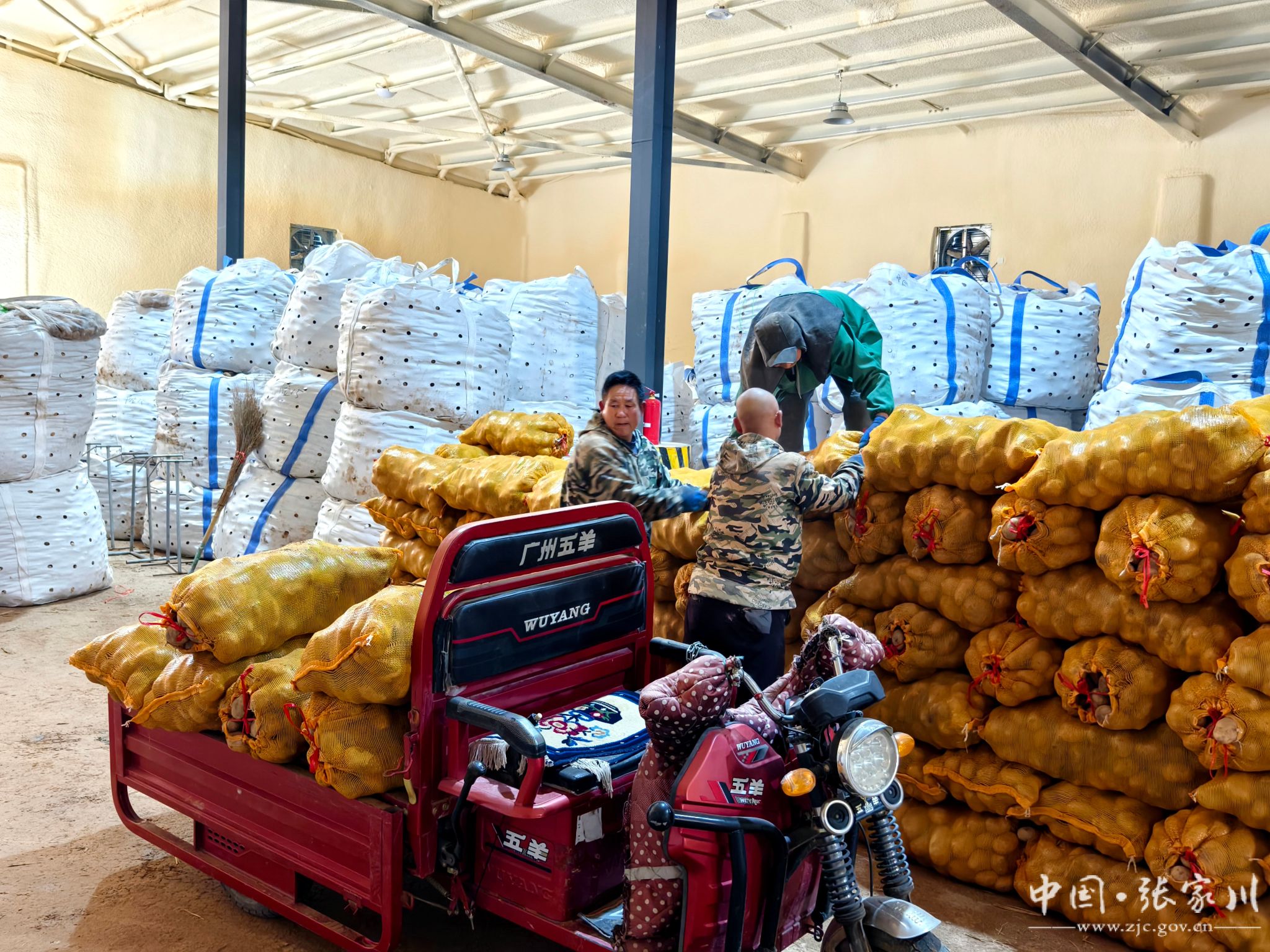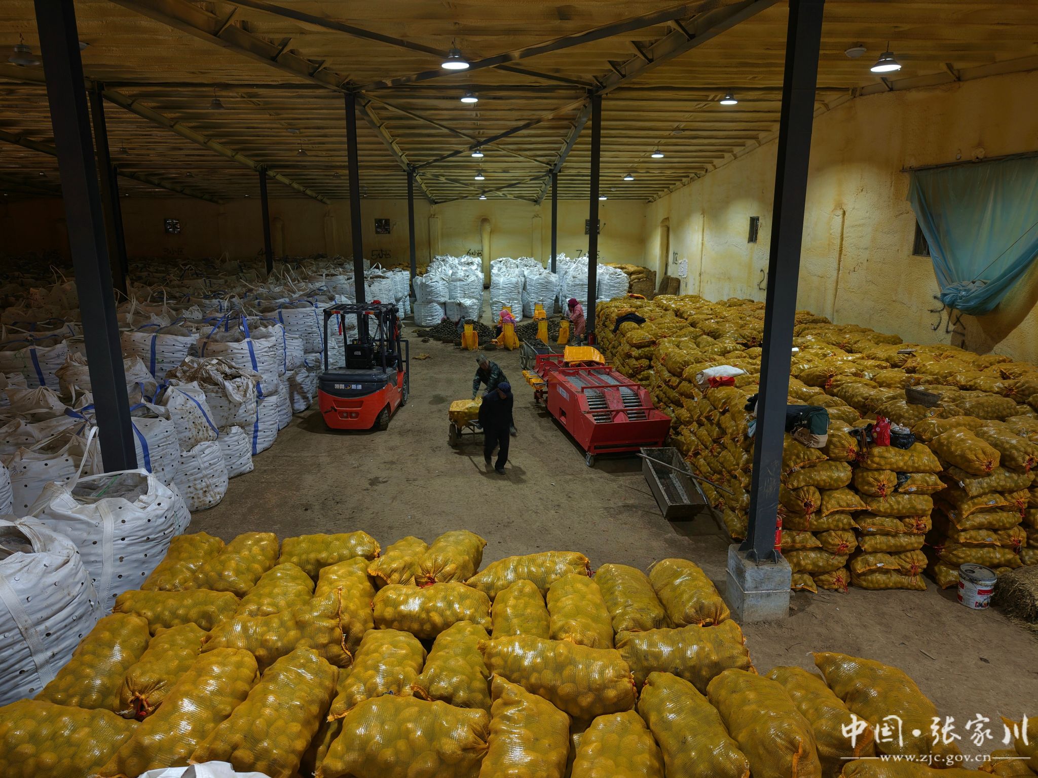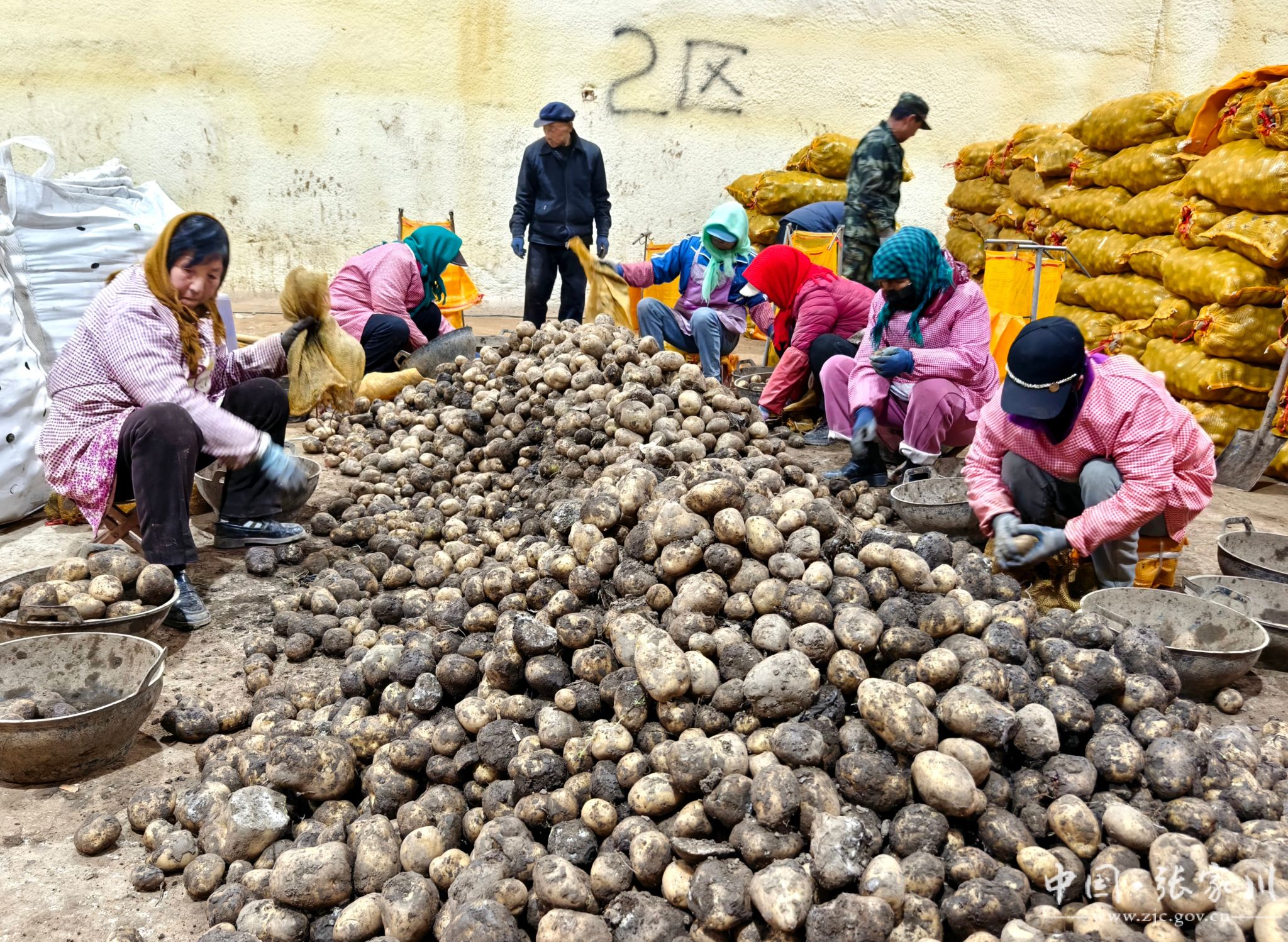 储藏库内,一派繁忙景象:1号库里,工人一边将马铃薯身上的泥土擦干净,一边按品种、大小进行分拣、装袋;2号库里,工人们正将一袋袋新鲜的马铃薯搬运入库,码放整齐;储藏库负责人余东海穿梭其间,仔细检查着储藏环境。