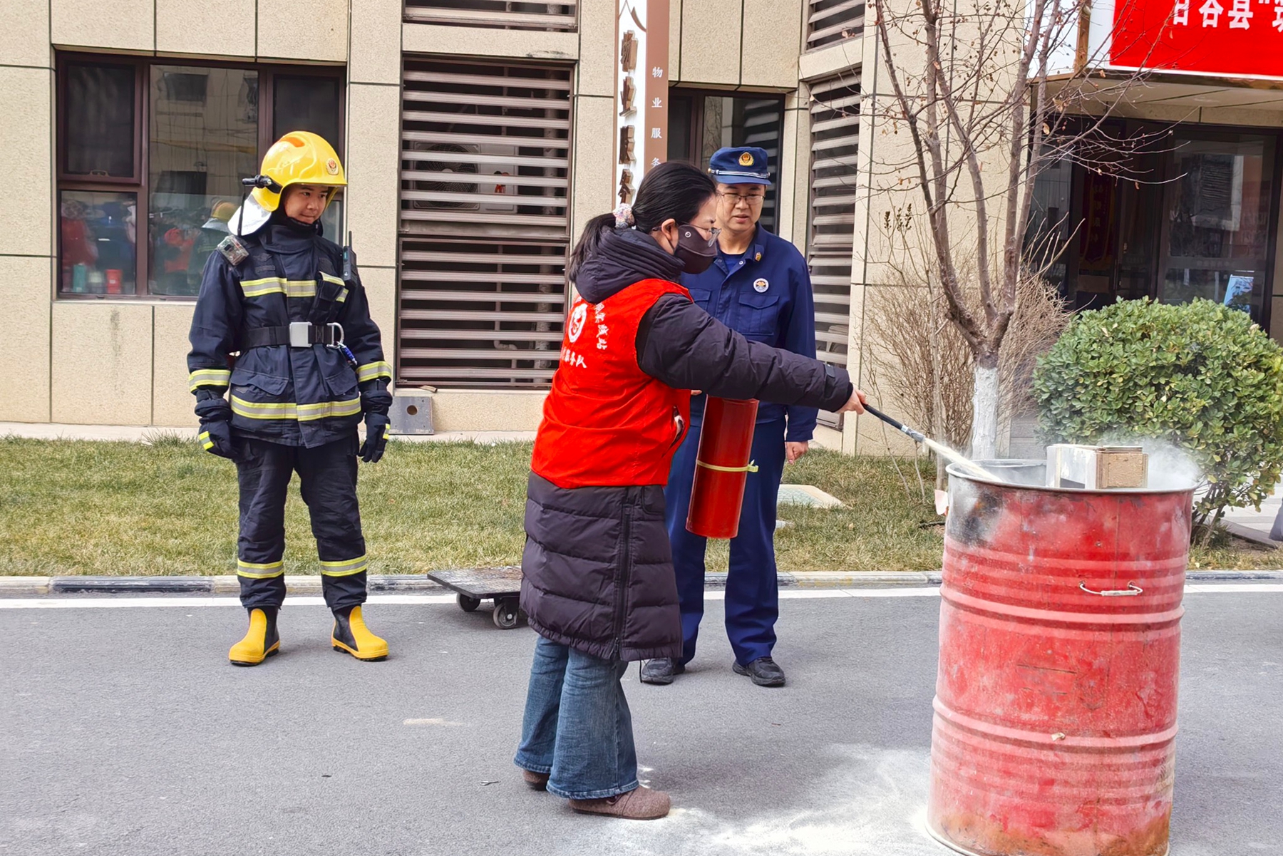 实操演练环节,消防人员利用燃烧桶起火场景,现场演示二氧化碳灭火器灭火全过程:对准火源根部持续喷射,通过左右扫射逐步推进,成功扑灭“火势”,直观展示了初期火灾扑救技巧。不少居民和志愿者在消防人员指导下亲自上手实操,在亲身体验中巩固操作技能。