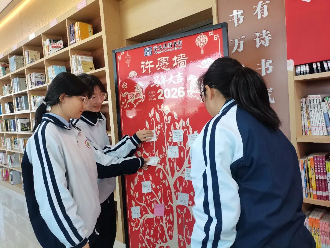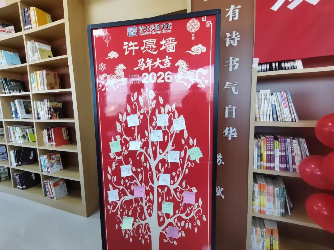 活动现场,清水县图书馆与博物馆工作人员并肩同行,与朝气蓬勃的同学们深度互动,一同解锁多元文化体验。读书分享环节,《人类群星闪耀时》《乡土中国》《郑和下西洋与和平交往》,同学们各抒己见,畅谈阅读收获,在思想碰撞中深化对典籍的理解和对情节的分享;经典诵读环节,学生诵读《琵琶行》时,语调低回婉转,一字一句,皆是故事,学生读《将进酒》时,语调豪迈铿锵,字字掷地有声,将诗中的狂放洒脱演绎得淋漓尽致;趣味十足的文博探秘·文化闯关互动环节中,两馆联动设置趣味关卡,同学们在欢声笑语里品书香、探文博,触摸历史厚度,汲取古人智慧,感受新时代的文化气息。活动尾声,图书馆精心筹备许愿树,同学们郑重写下新年愿望、阅读计划、文博感悟,以及对家乡的美好期许,将寄语贴于枝头,以书香为伴,以温情寄语迎接新岁。