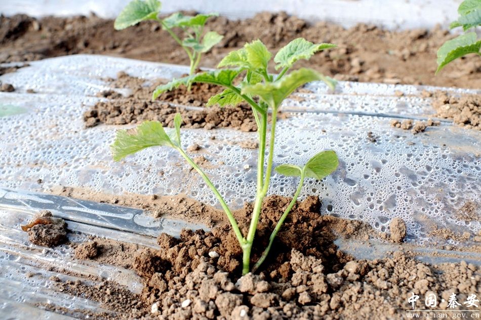 “总共种了十五个大棚,其中有六棚白脆瓜,九棚西瓜,现在是进入松土预防状态,再过三五天就该给瓜苗掐头了,按这个长势,四十多天后就能采摘上市。”基地管护人员王新科向记者介绍。