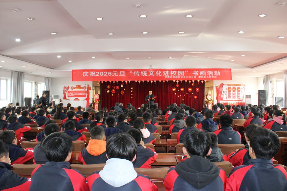 新天水讯 据麦积区融媒体中心消息 1月4日,麦积区“传统文化进校园”书画活动在天成学校举行。全区书画界代表与学校师生三百余人齐聚一堂,以笔墨迎新年,共同感受中华优秀传统文化的深厚魅力。