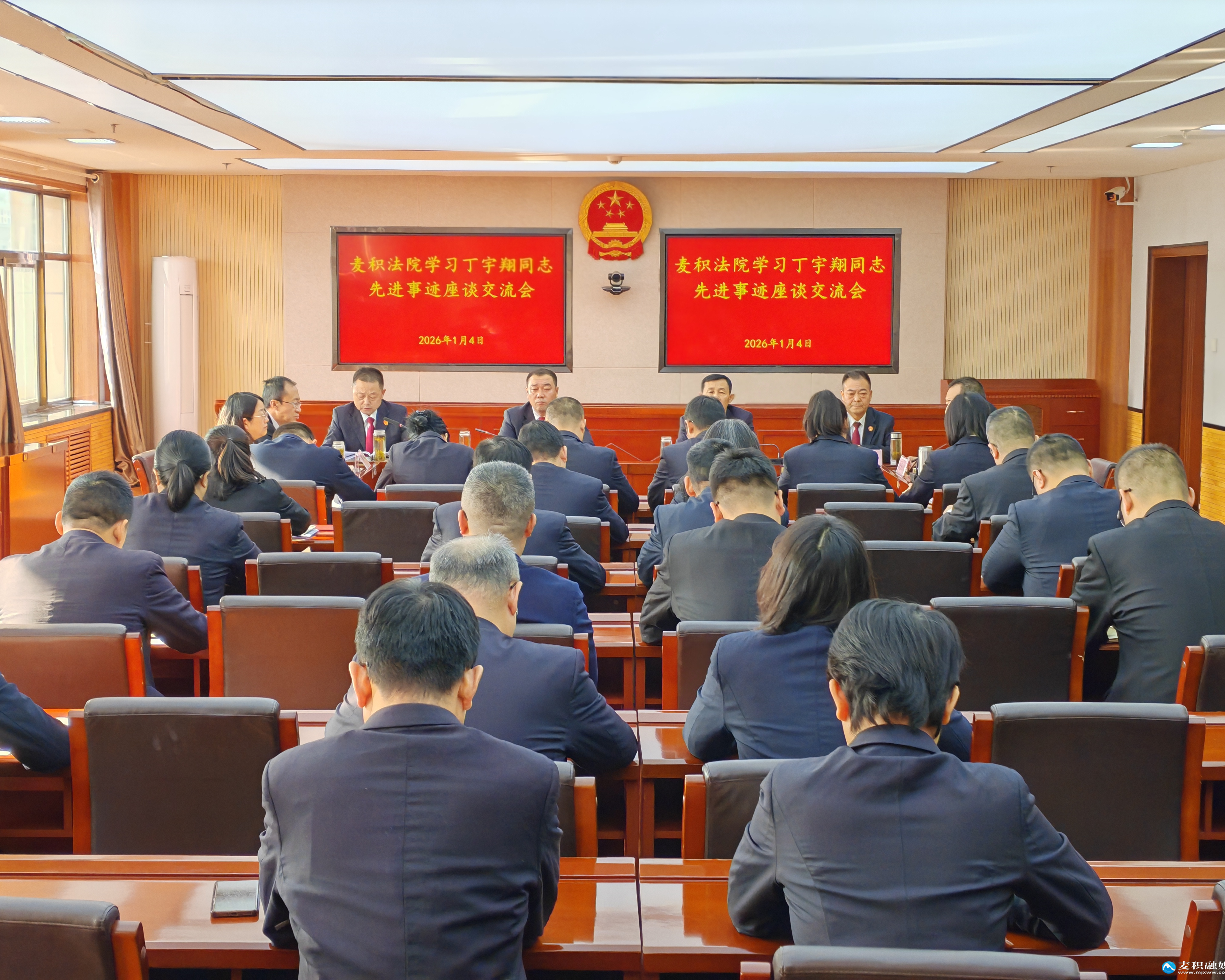 新天水讯 据麦积区融媒体中心消息 1月4日下午,麦积法院召开学习丁宇翔同志先进事迹座谈交流会。院领导班子成员、各庭室负责人及青年干警代表参会。会议旨在深入学习践行丁宇翔同志对党忠诚、司法为民的先进事迹,引导全体干警以榜样为引领,坚守初心使命,将学习成果转化为推动审判工作的实际成效。