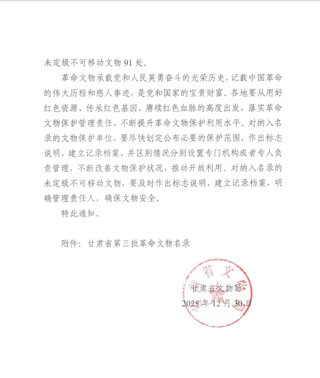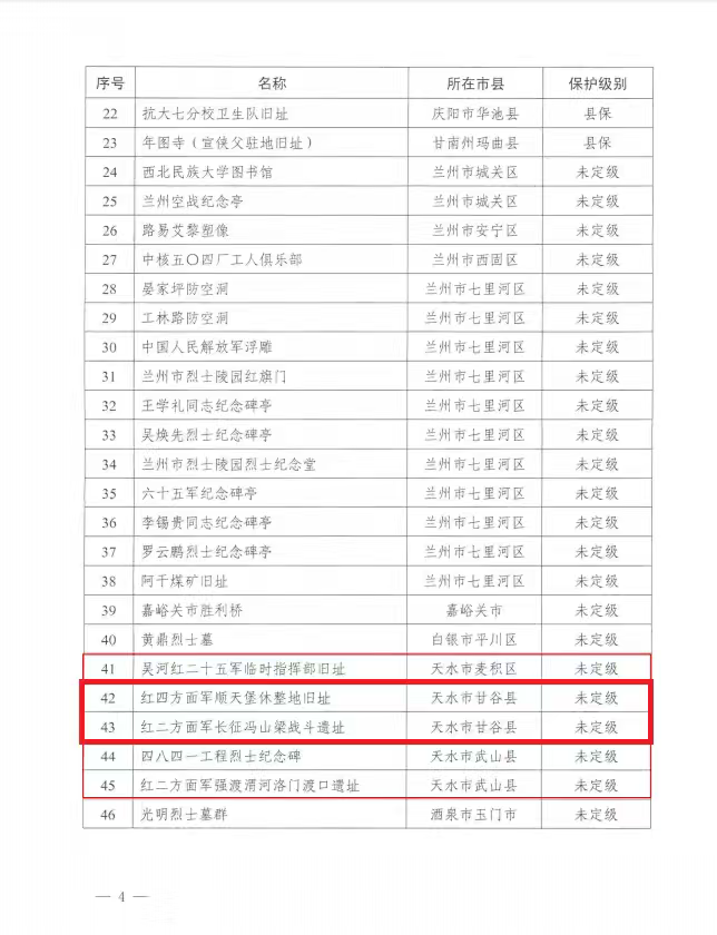 新天水讯 据甘谷县融媒体中心消息 近日,甘肃省文物局公布了第三批革命文物名录,我县红四方面军顺天堡休整地旧址、红二方面军长征冯山梁战斗遗址两处不可移动文物成功入选。
