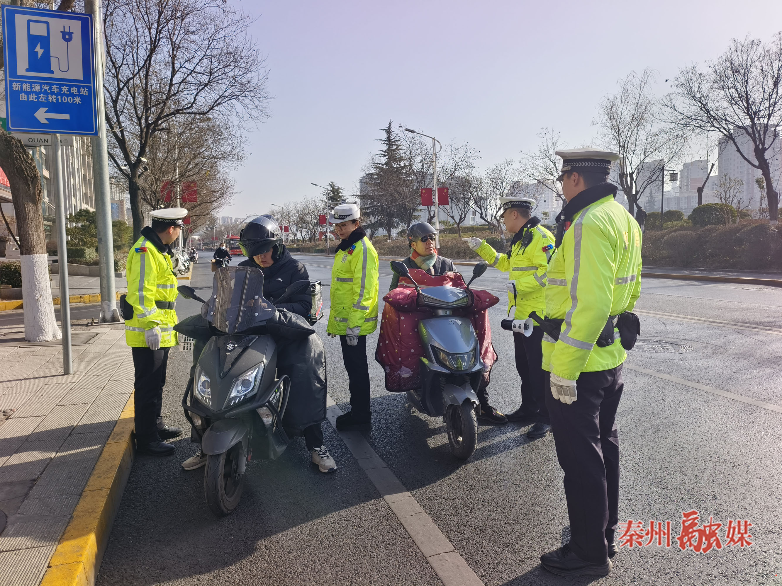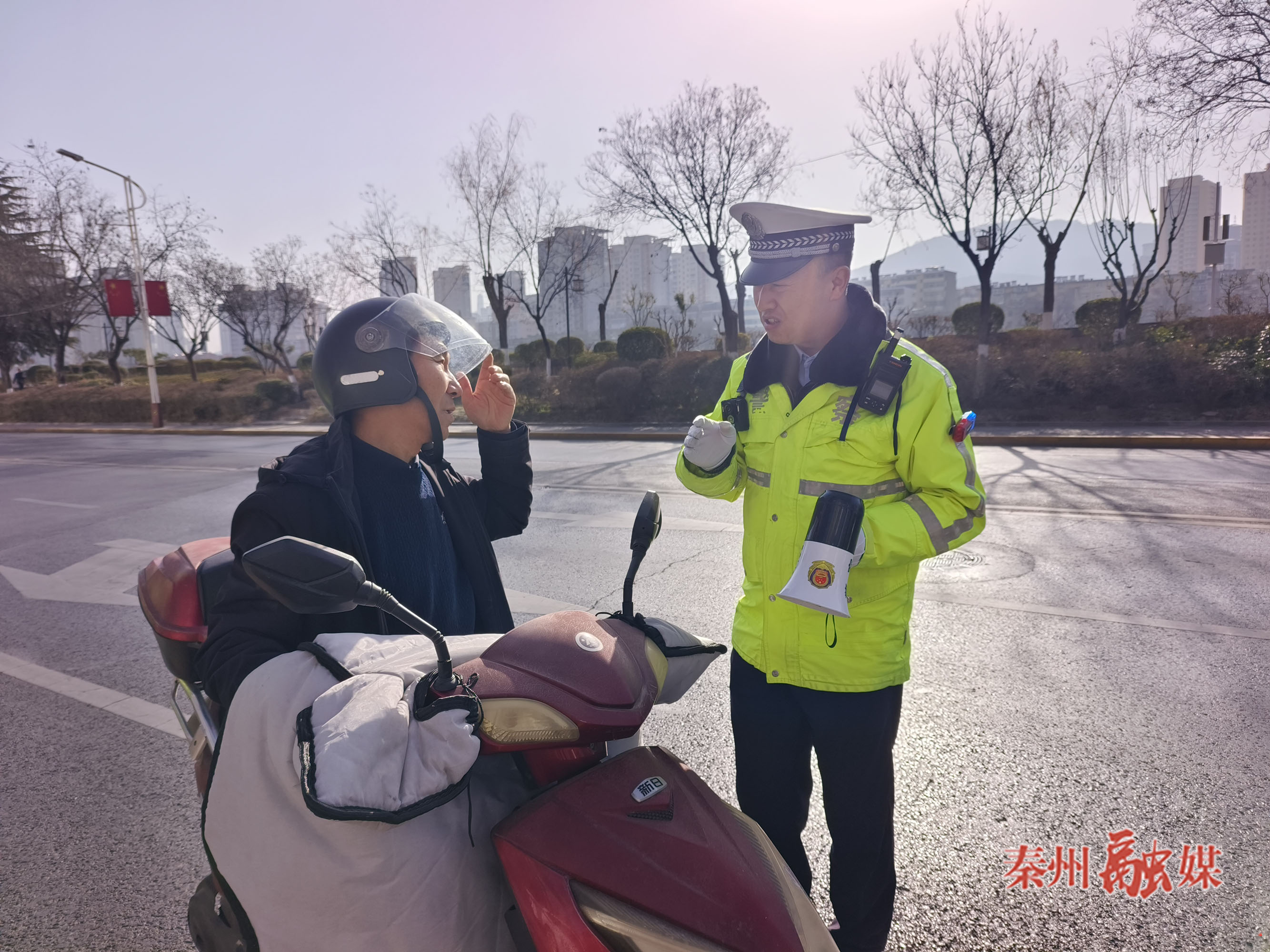 同样,秦州区万达十字路口地处繁华商圈,人流车流量密集。记者看到,秦州交管大队执勤一中队民警正在路边拿着小喇叭劝导来往电动车安全出行。