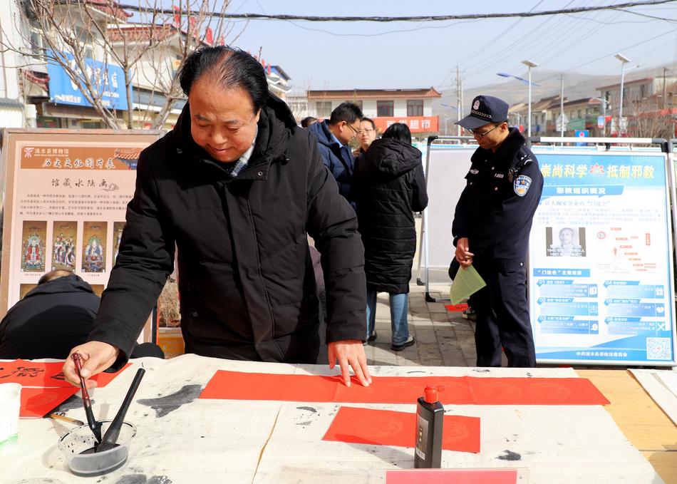 法治宣传与政策咨询展位前,志愿者通过摆放展板、发放宣传资料等形式,向村民普及民法典、乡村振兴促进法等法律法规,解读惠农补贴、医保社保等民生政策。县司法局组织的法律服务团队耐心解答土地流转、邻里纠纷等群众关心的法律问题,引导村民依法维护自身权益,为乡村治理注入法治力量。另一边,县文联的书法家们挥毫泼墨,将新春祝福融入笔墨间,一幅幅寓意吉祥的春联与福字被村民们争相领取,为寒冬增添了浓浓的年味与暖意。