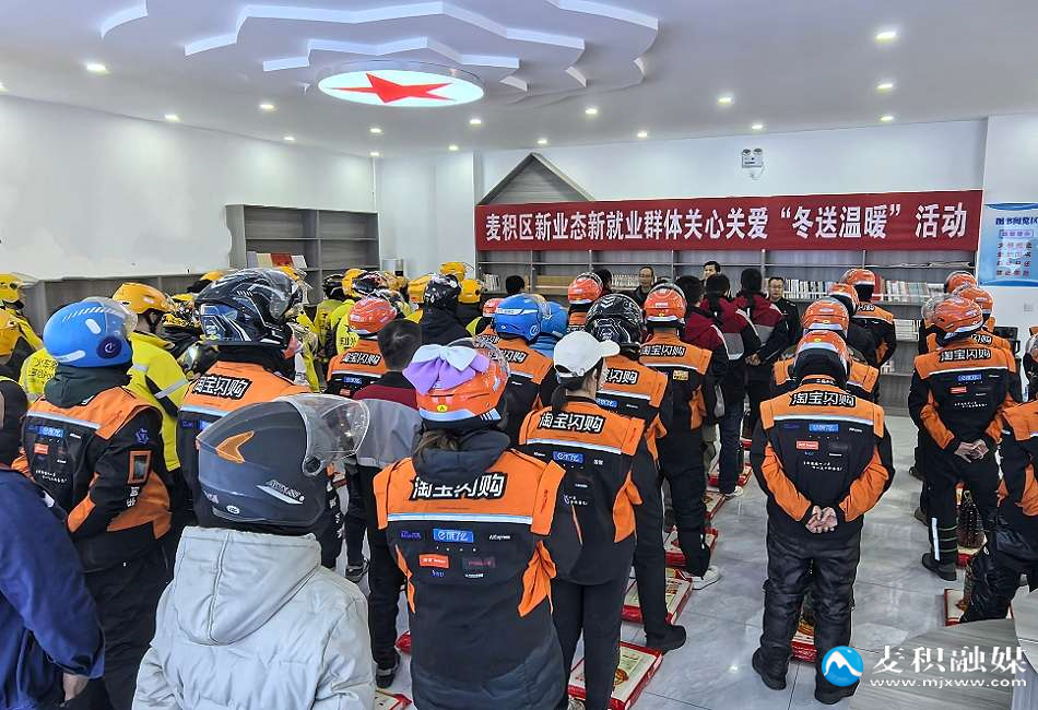 新天水讯 据麦积区融媒体中心消息 临近春节,2月6日下午,麦积区总工会联合区社会工作部、区市场监管局、区交通运输局,在麦积区新兴领域区域性党群服务中心红色驿站举行“冬送温暖”新就业形态群体集中慰问活动,为快递员、外卖配送员、货车司机等一线劳动者送上慰问物资与新春祝福,把党和政府的关怀、工会组织的温暖送到新就业形态劳动者身边。