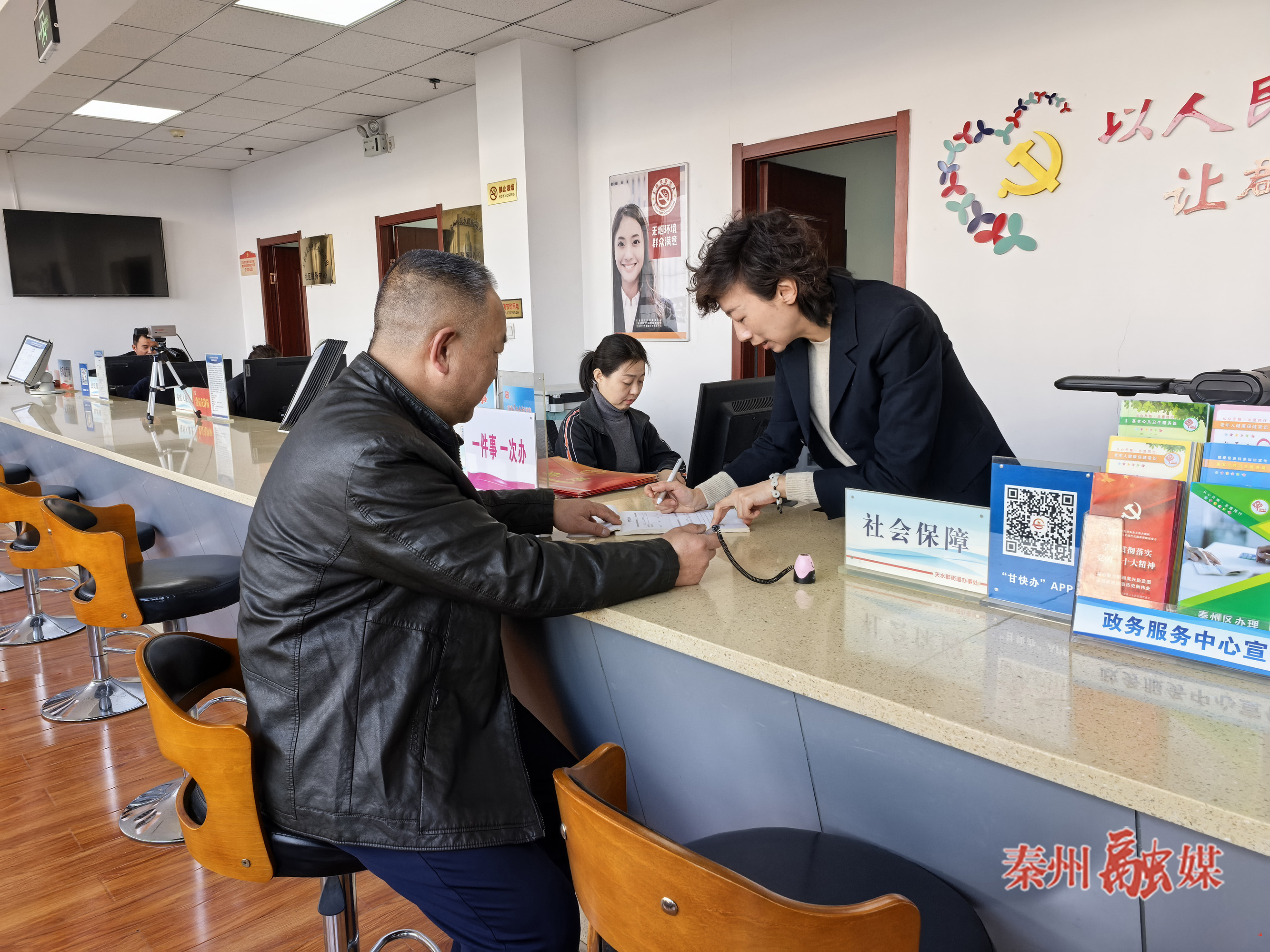 同样,在天水郡街道办事处,工作人员按时到岗,进入工作状态。居民侯庭义来到街道办事大厅,为自己和家人办理养老保险新参保业务。工作人员热情接待、细致指引、快速办理,用贴心服务和高效流程,让群众办事更省心、更舒心。