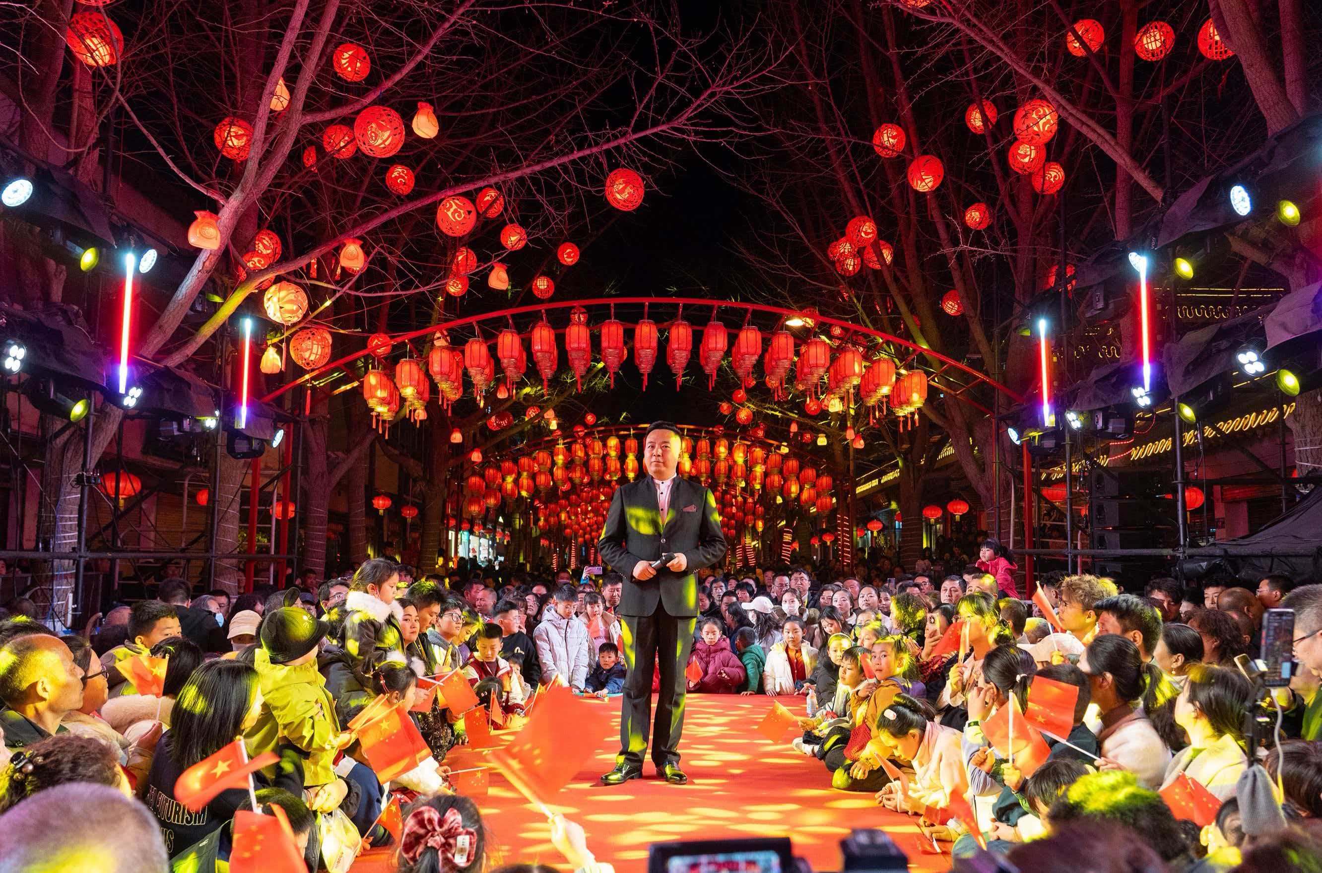 节日期间,“迎客天下·幸福秦州”——欢乐秦州年第二届文化旅游活动周在青年北路拉开帷幕。华灯初上,红灯笼与霓虹灯交相辉映,尽管春寒料峭,现场已是人山人海、暖意融融。活动在歌曲《一路生花》中热烈开场,趣味互动环节迅速点燃全场热情。随后,《撸起袖子加油干》《甘肃老家》《天水在哪里》等节目轮番登场,激昂旋律与温情曲调交织,引发全场大合唱。翻飞的旗海与阵阵欢腾,将现场汇成一片喜庆的海洋。