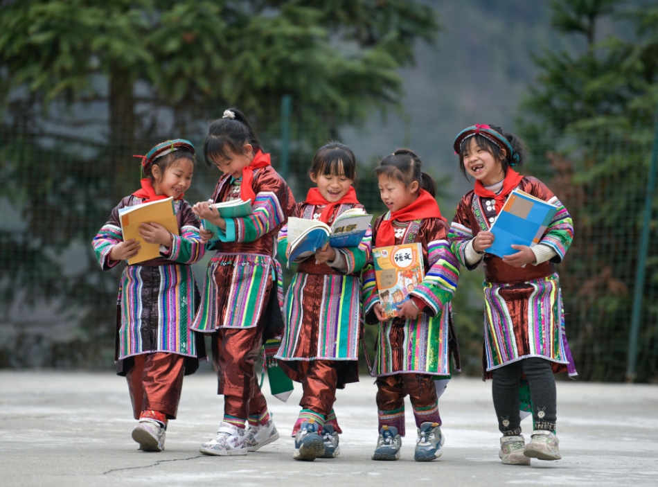 2023年2月16日,在贵州省从江县西山镇中寨教学点,领到新书的瑶族学生在一起交流。新华社记者 杨文斌 摄