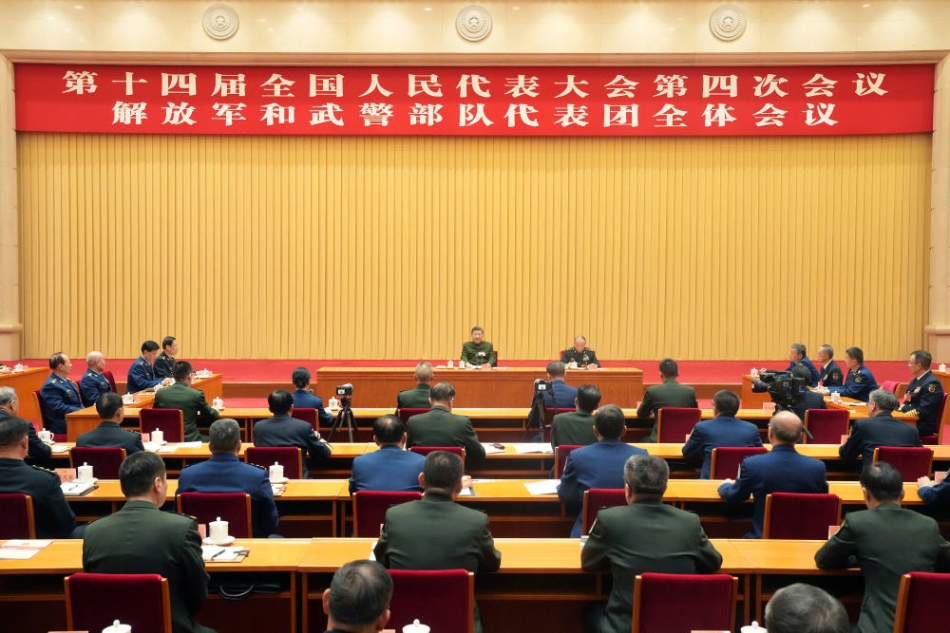 3月7日下午,中共中央总书记、国家主席、中央军委主席习近平出席十四届全国人大四次会议解放军和武警部队代表团全体会议并发表重要讲话。新华社记者 李刚 摄