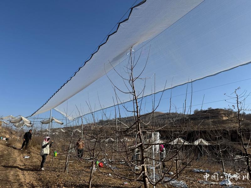 新天水讯 据张家川县融媒体中心消息 日前,记者走进张家川县连五乡贠家村祥禾源果业的三百亩苹果基地看到,果树褪去了繁叶,枝干线条分明。祥禾源果业创始人哈建峰正带着他的两个儿子,和十多位工人一起忙碌在修剪一线。妻子马秀英则在不远处的工棚里,为忙碌的人们准备着热茶和简单的午饭——这家人正用最质朴的方式,共同经营着他们的果园梦。