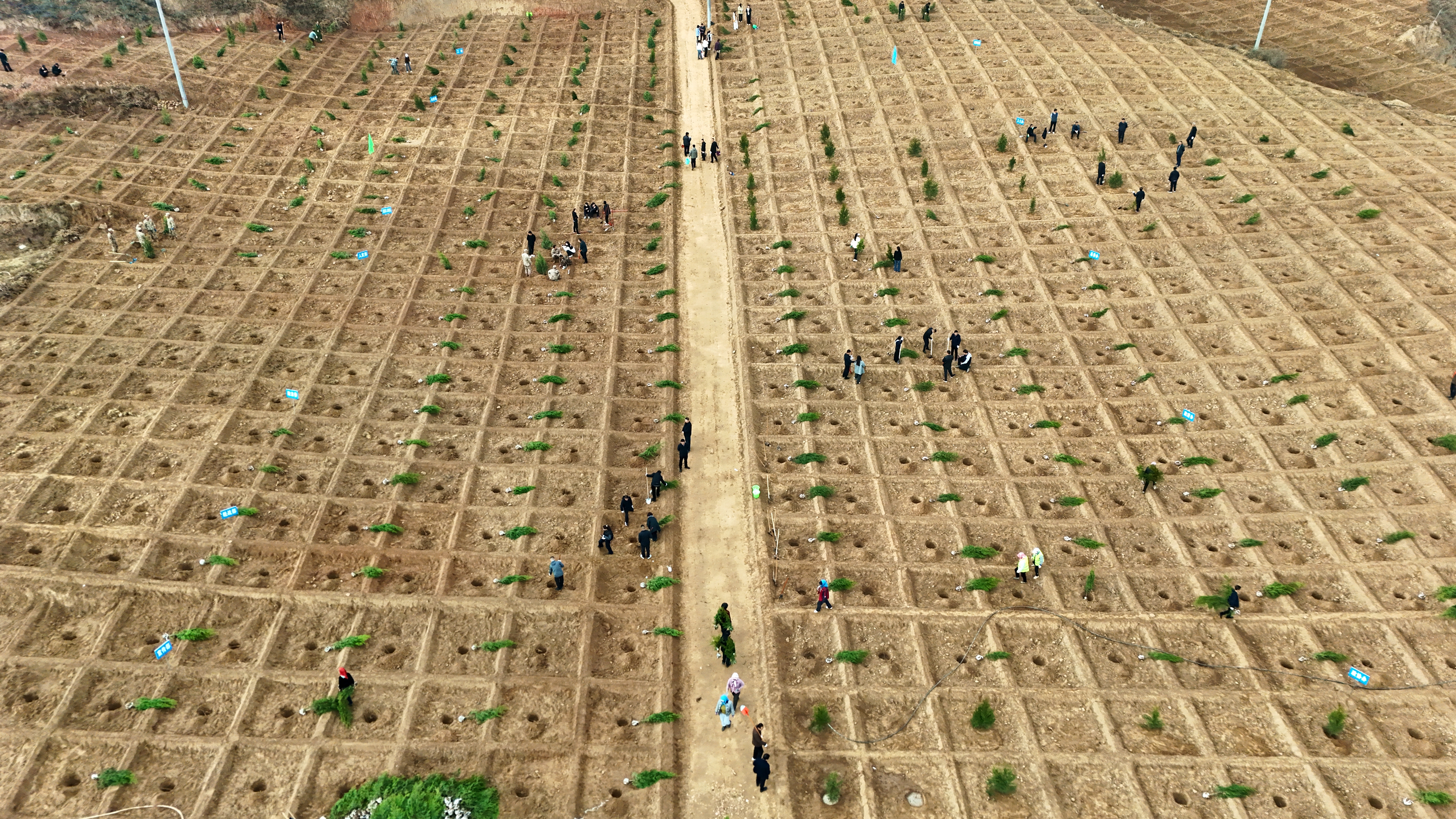 义务植树活动现场,大家挥锹铲土、培土围堰、提水浇灌,共栽植乡土树种侧柏、刺槐等苗木8万株,完成植树1000亩。同时,三北“六期”渭河上游南部秦岭西段水源涵养与生物多样性保护恢复人工造林、退化林修复和封山育林项目盘龙山车家林实施区内工人们正在热火朝天地开展植树造林,今年计划栽植当地乡土树种油松、桦山松、刺槐、山杏等苗木128万株,全面完成盘龙山区域8万亩造林任务。