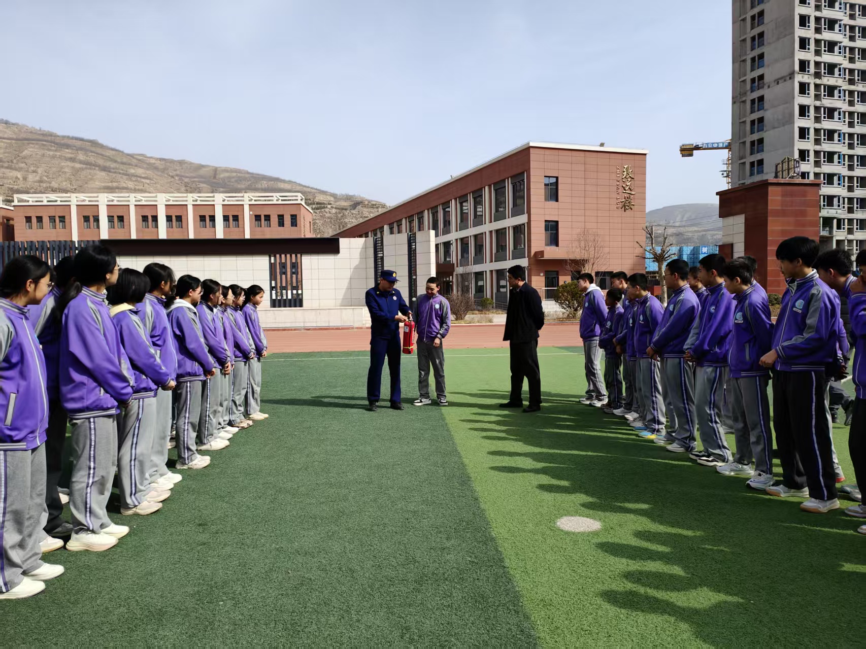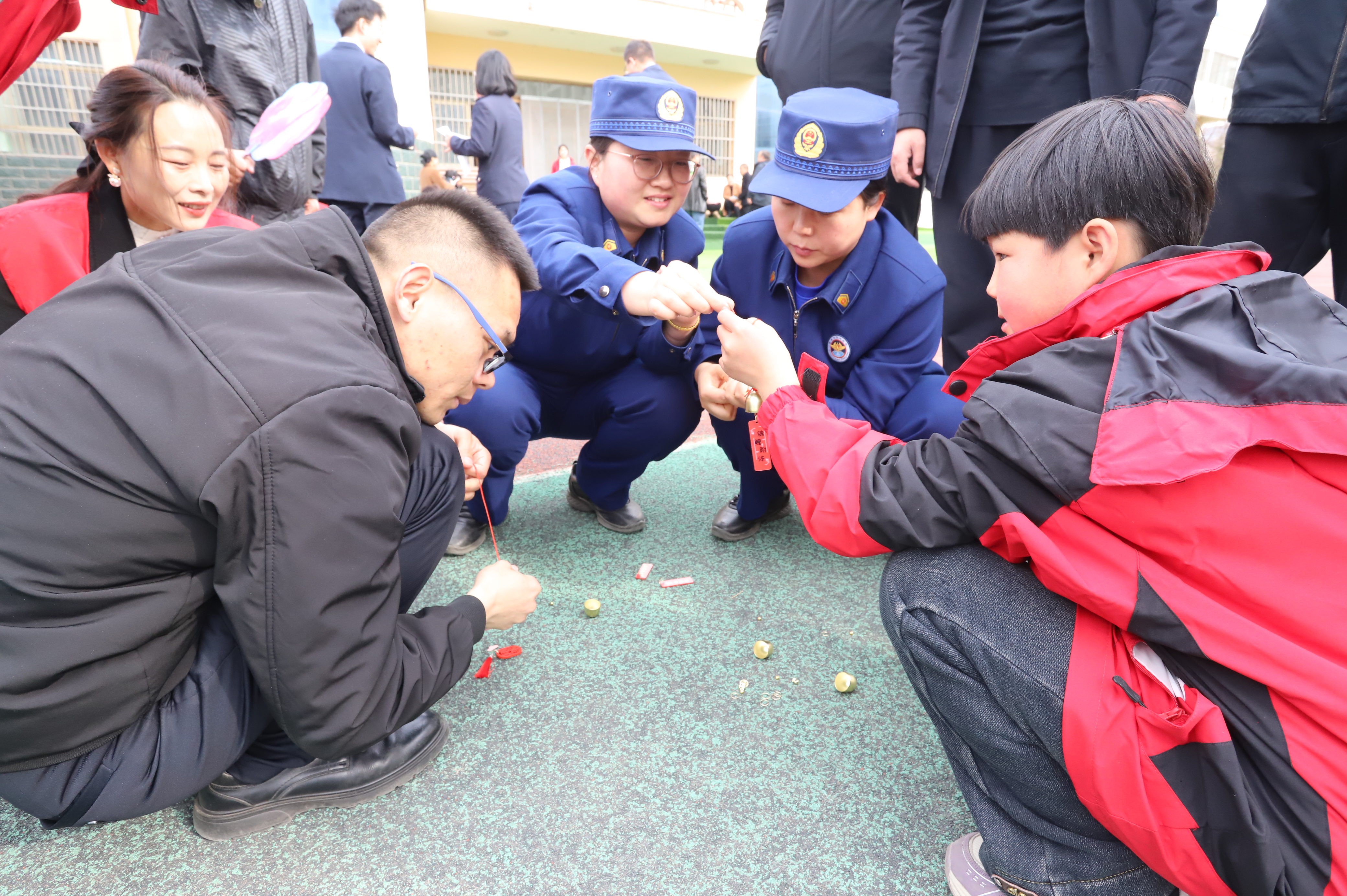 实操体验环节亮点纷呈。消防人员现场演示灭火器“提、拔、握、压”操作步骤,讲解消防水带铺设、自救呼吸器佩戴等技能,展示各类消防装备用途。随后,邀请师生代表亲自实操,手把手指导灭火器使用、装备佩戴,让大家在实践中掌握实用消防技能,实现“学懂会用”。