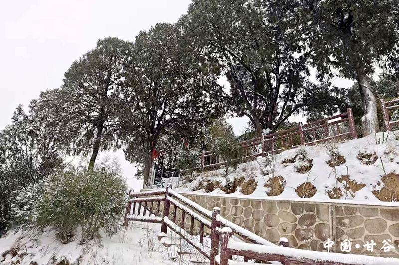 步入天门山,皑皑白雪如絮般铺展在层层梯田与蜿蜒步道之上,苍松翠柏缀满雪团,侧柏的深绿与雪色交织成画,尽显黄土高原的雄浑生机。木质登山栈道覆着薄雪,踩上去沙沙作响,漫步其间,山风裹挟着清冽寒气,将古木虬枝的轮廓与亭台飞檐的剪影晕染成静谧诗行,让人恍若置身千年之前的陇右胜境。