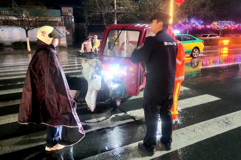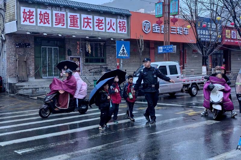 连日来,面对连绵春雨,特警大队科学部署警力,在学校门口、斑马线旁、拥堵路段等重点部位加大执勤力度。哨音清脆,手势利落,那一抹抹藏蓝身影穿梭于车流人流之中,护送一批又一批学生安全通过马路,提醒过往车辆减速慢行、注意避让。