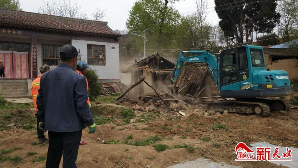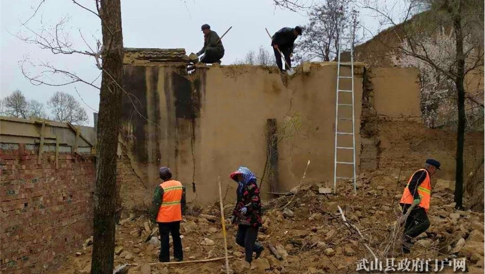 在玉泉镇李官湾村,党员干部正带领村民对危旧房屋进行拆除,对部分破损墙面加固维修。