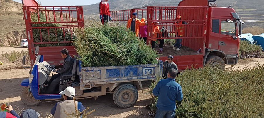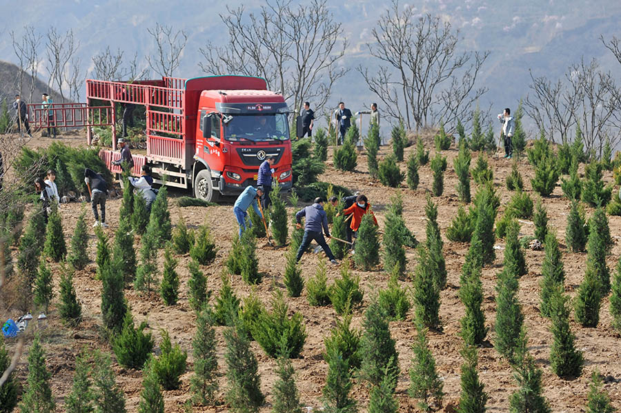 3月24日,天水市市直部门和秦州区区直部门的干部职工在秦州区玉泉镇石马坪村文山梁开展义务植树活动。