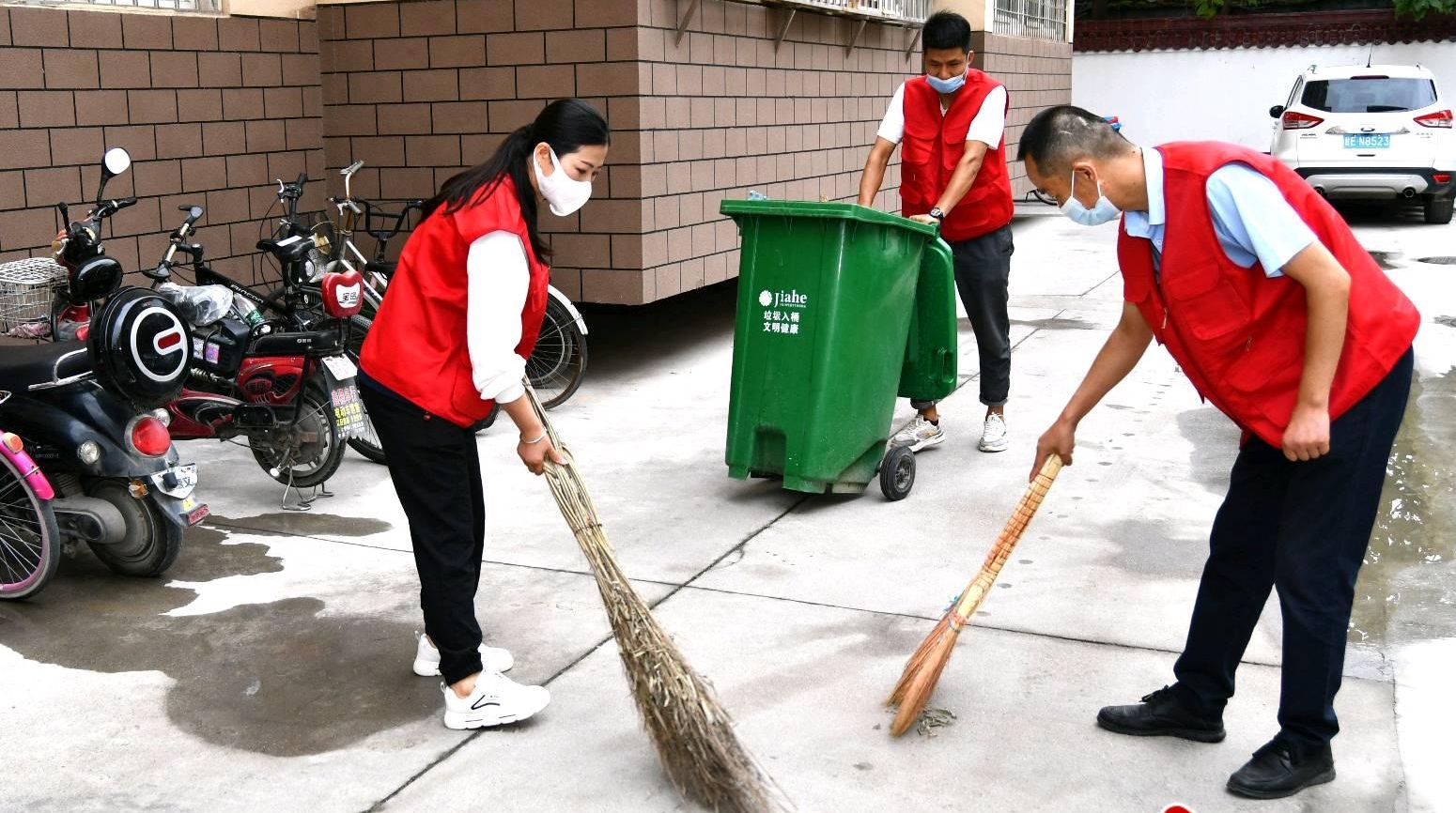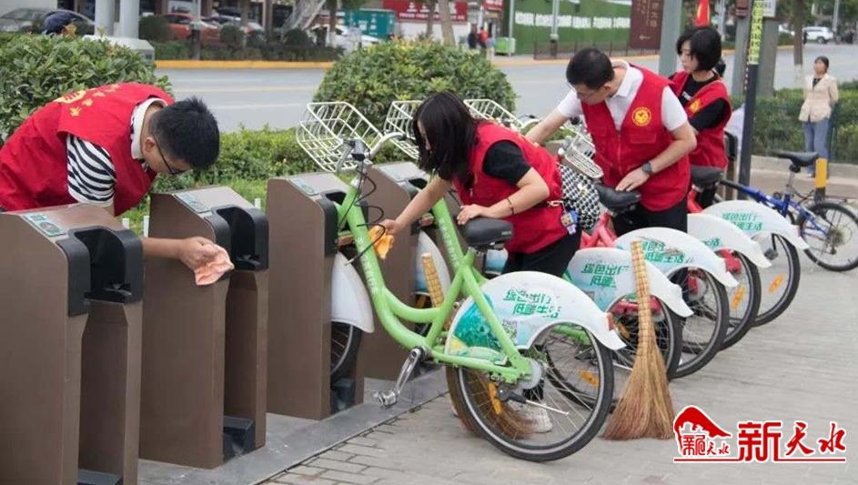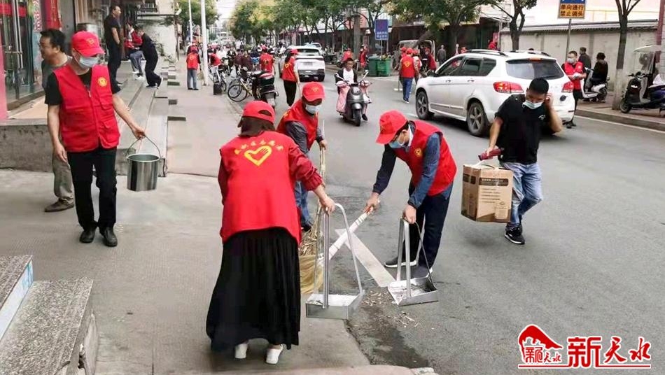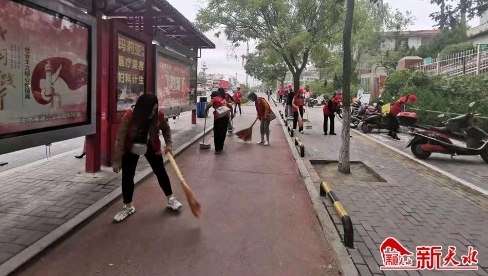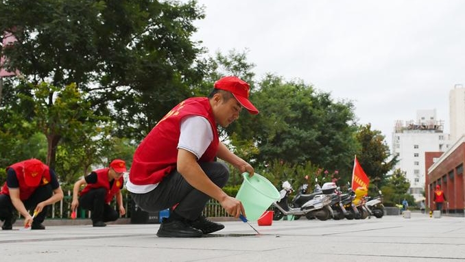 9月4日一大早,团市委、市教育局、市文联的志愿者们身穿“红马甲”活跃在城区各个街巷,打扫卫生,整治环境。