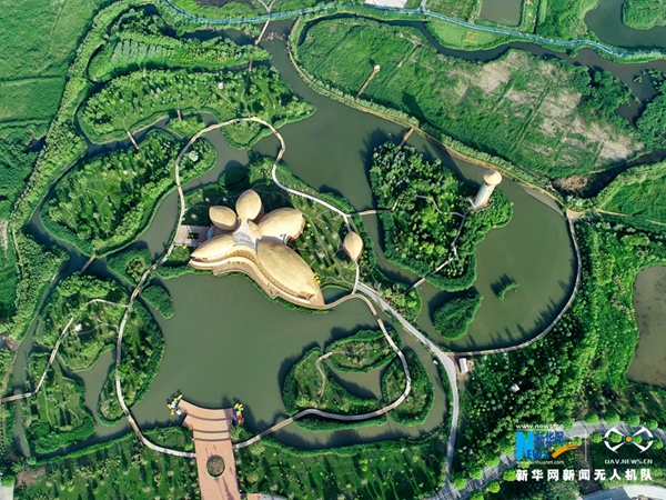 6月16日,无人机航拍镜头下的甘肃张掖国家湿地公园。张掖国家湿地公园位于甘肃省张掖市甘州区城郊北部,与市区紧密相连,湿地主体位于城区北郊地下水溢出地带,与城区毗邻,被喻为“城市之肺”。