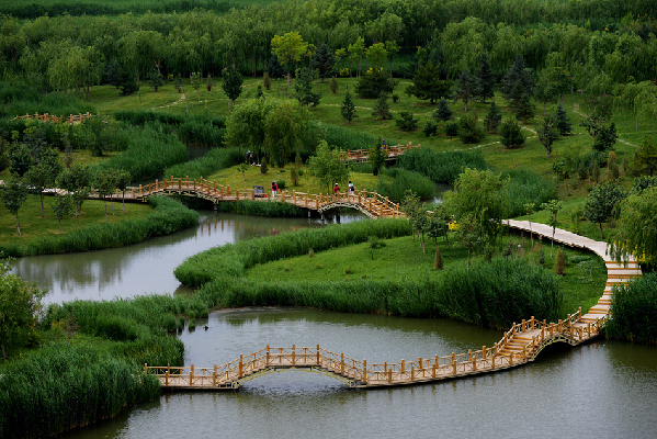 航拍甘肃张掖“城市之肺” 波光潋滟满目生翠