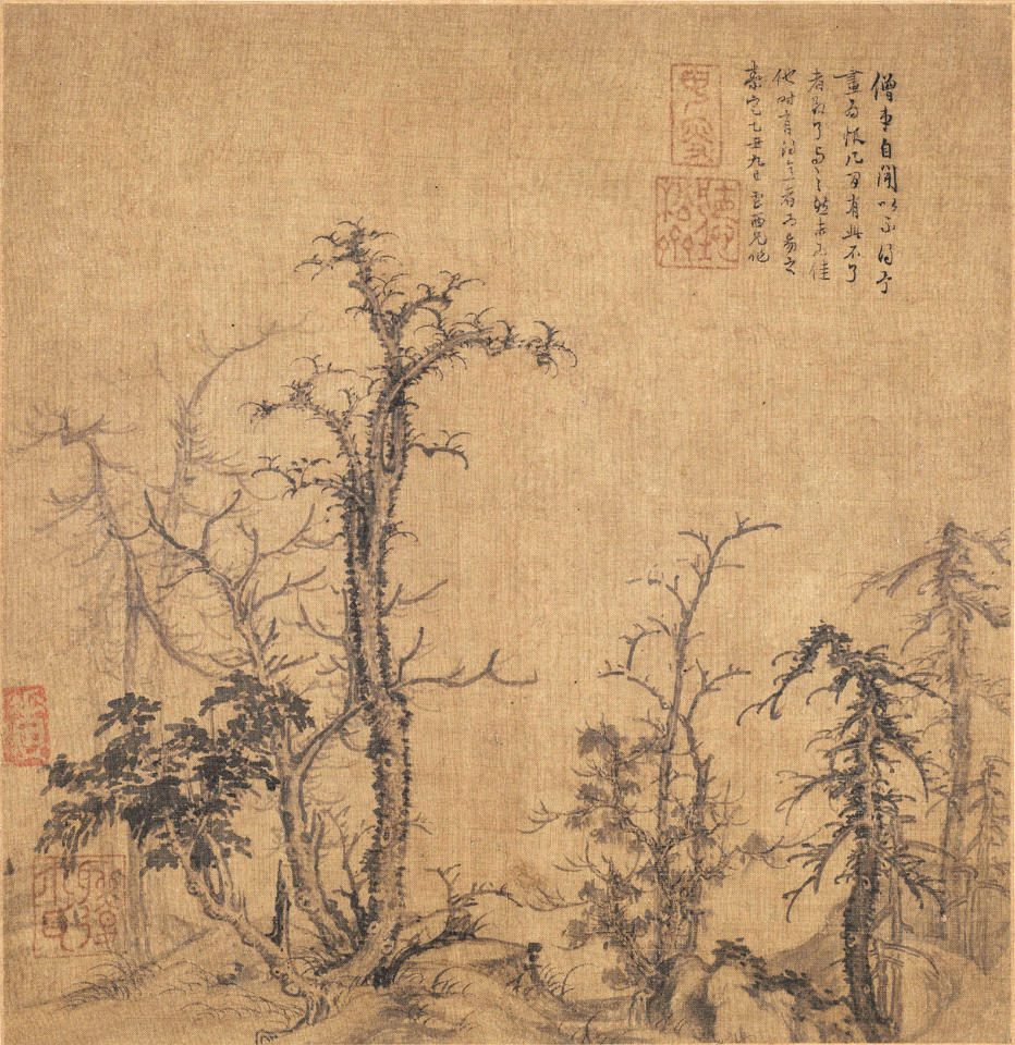 《寒林图》为水墨坡石寒林,比较简洁。近处荒草稀疏的坡石之间,有前后不一的寒树五丛,两丛墨色浓重,三丛淡墨为之,越远越淡,与后面留白的天空自然相接。物象虽简,墨色层次与景深空间也还不错。