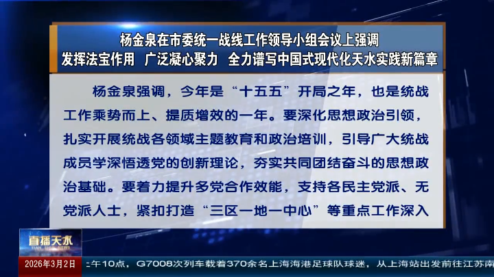 直播天水|杨金泉在市委统一战线工作领导小组会议上强调 发挥法宝作用 广泛凝心聚力 全力谱写中国式现代化天水实践新篇章