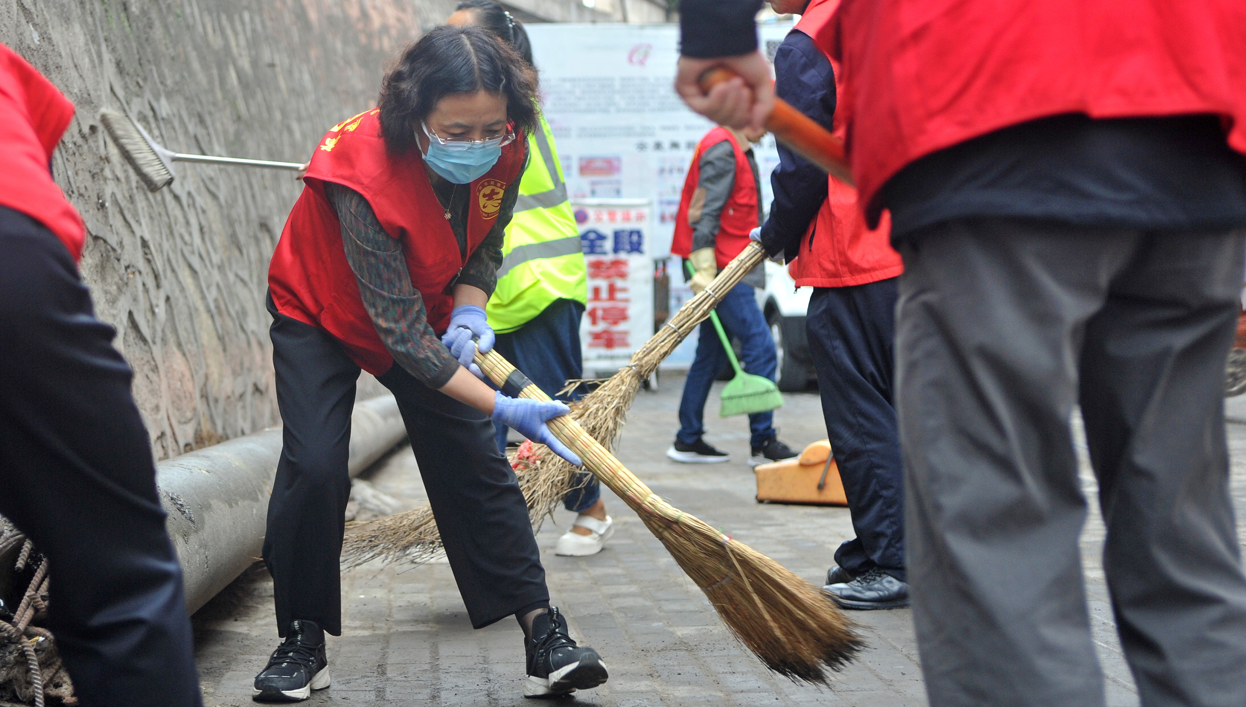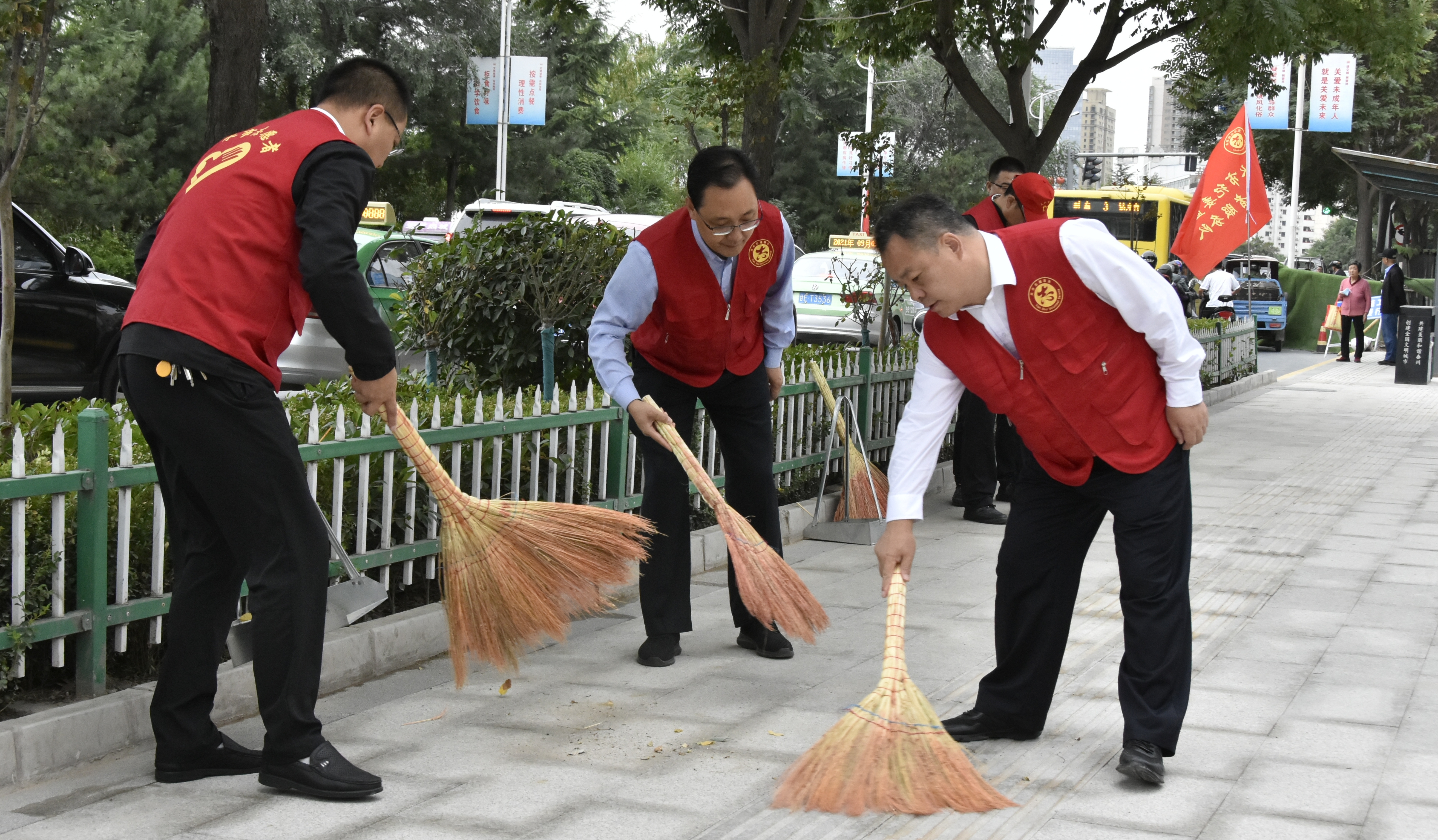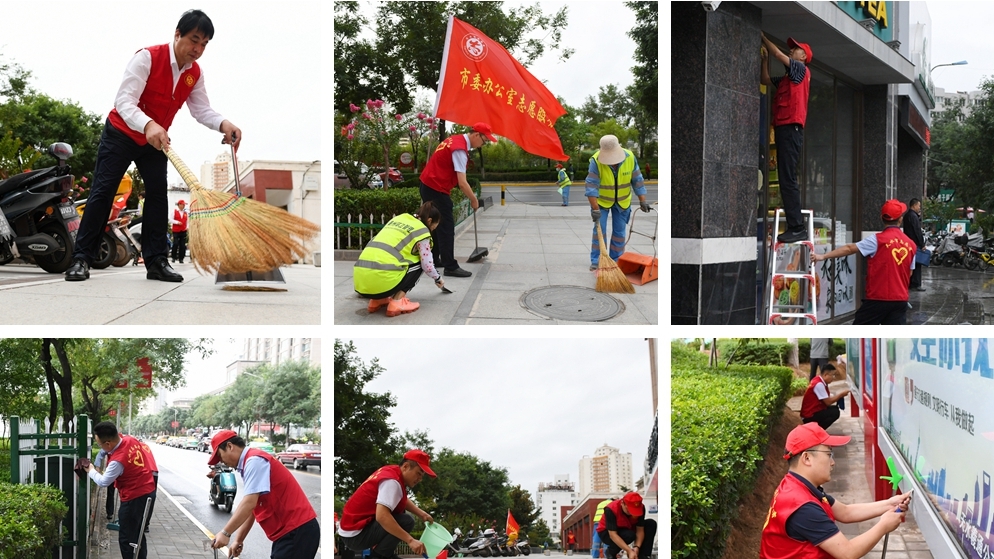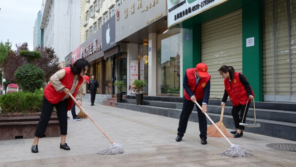 9月4日一大早,团市委、市教育局、市文联的志愿者们身穿“红马甲”活跃在城区各个街巷,打扫卫生,整治环境。