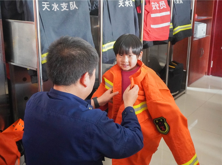 3月16日,甘谷县大像山镇小清华幼儿园的100多名小朋友走进甘谷县消防救援大队参观学习,“零距离”感受消防魅力,试穿消防战斗服,过足了一把“消防瘾”。