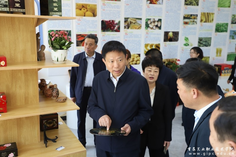 在新商科楼,调研组一行着重参观了经管学院陇货甘味天水特色馆,重点了解了天水的特色产品及具有悠久历史文化的文创产品。费志荣就学生实训、直播带货效益及校企合作问题与工作人员进行亲切交谈。
