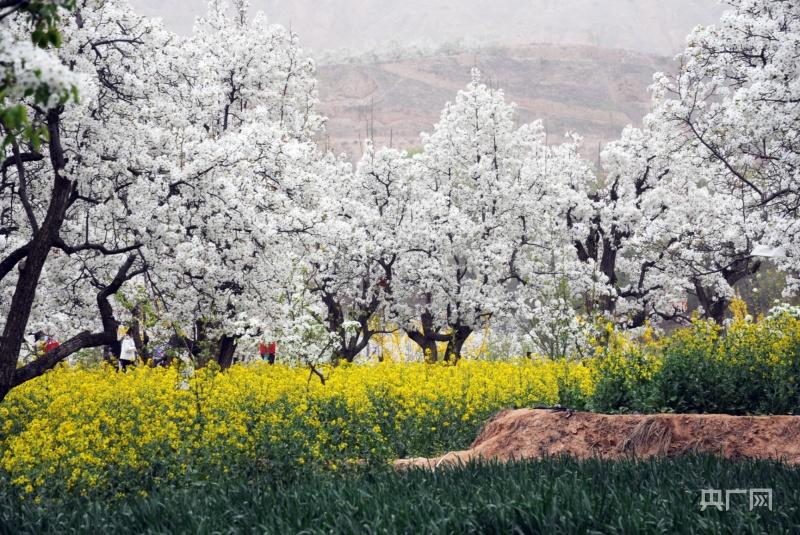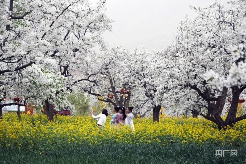 央广网定西4月21日消息(记者李红军)最美不过四月天,梨花遍开映东川。位于甘肃省临洮县龙门镇东三十里铺村的东川梨园,一簇簇雪白的梨花开迎风绽放似团团云絮,与树下金黄色的油菜花和绿油油的小麦相互映衬,散发出沁人心脾的花香。春风拂过,阵阵清香在漫山遍野弥漫开来,吸引了不少周边游客前来赏花拍照。