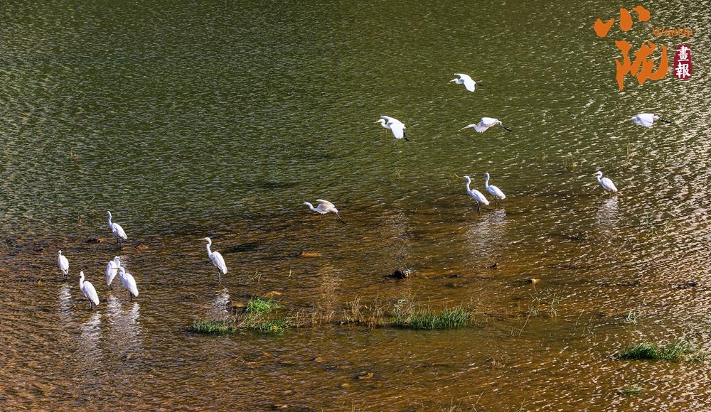 天蓝、水清、田绿、树青,成群的白鹭在子午岭上方自由飞翔,时而在水面或河岸追逐嬉戏。