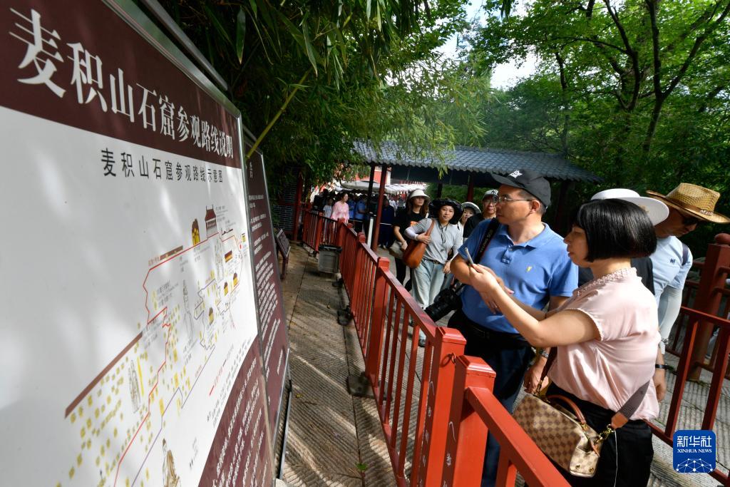 7月30日,游客在麦积山石窟查看参观线路示意图。新华社记者 范培珅 摄