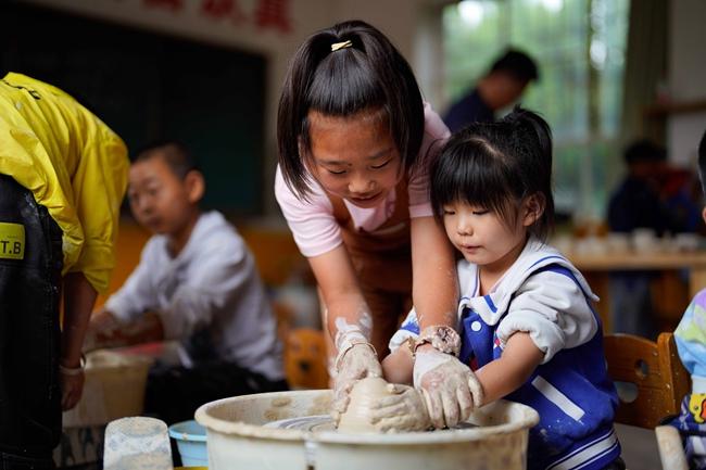 定西市陇西县杨营村“爱心陪伴”假期托管班中,孩子们正在上陶艺课。甘肃省总工会供图