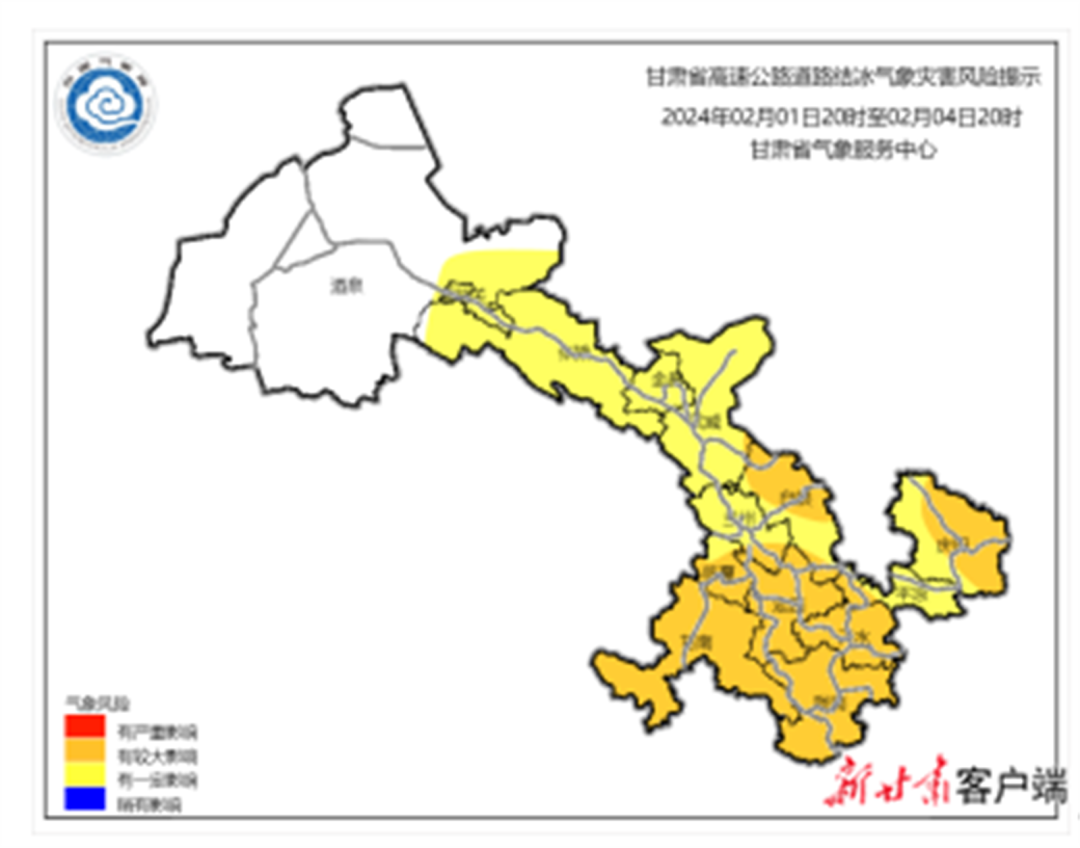 春运交通方面,2月1日夜间至4日,我省大部路段降雪及道路结冰气象灾害风险较低,其中刘白高速、白兰高速、康临高速、临合高速、双达高速(双城—韩集)、临大高速(积石山)、安临高速、乌玛高速(广河—和政)、临合高速(临夏到合作)、巉柳高速(定西—和平)、天巉二级公路、陇渭高速、天定高速、临渭高速、陇漳高速、天水过境段、宝天高速、平绵高速、徽天高速、成武高速、武罐高速、西长凤高速、银百高速气象灾害风险较高。(新甘肃·甘肃日报记者 海晓宁 于晓明)