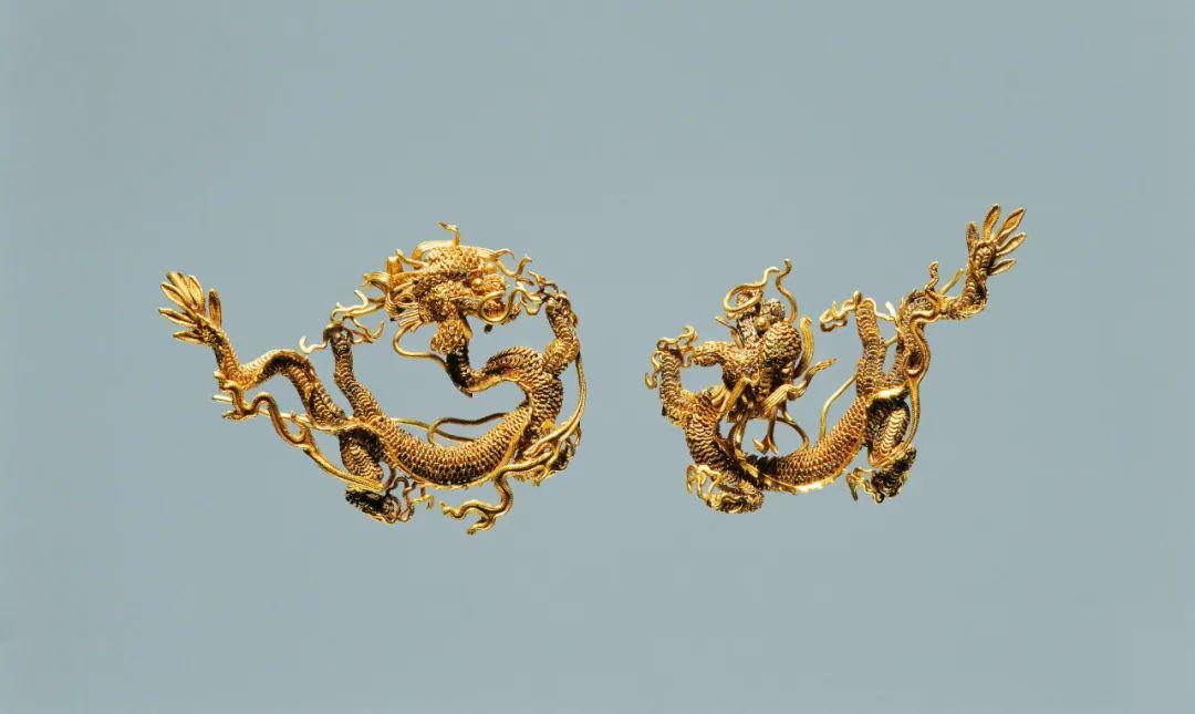 高4厘米,宽2.5厘米,重9.8克。以掐丝、累丝等技法编结、拧勒而成。龙首耸额巨目,鬣发飞扬,神情凶猛;龙足屈伸相应,利爪如钩,充满力度;龙身似盘似舒,蜿蜒多态;龙尾分叉,形状若叶,轻轻摆动,再配以摇曳的飘带般长须,刻画出飞龙的动势。制作工艺精细入微,造型栩栩如生。现藏甘肃省博物馆。