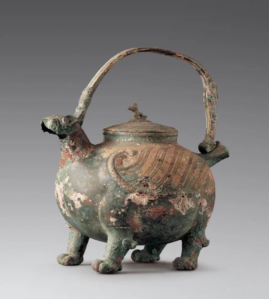 泾川县出土,高30.2厘米,纵20.8厘米,横22.5厘米。盉体被设计为一四足怪兽。兽首微昂,张嘴为流,略翘的短尾为銴,器腹深圆,粗矮而趾爪向前的四腿,即为盉的四足。提梁呈龙形,盖中心亦饰一小翼兽为钮,盖与器身用一小环连接。器腹两侧各浮雕一飞龙,龙体遍饰鳞纹。龙做回首状,并各有五条扬起的羽翼,两只飞龙恰构成兽的双翼。