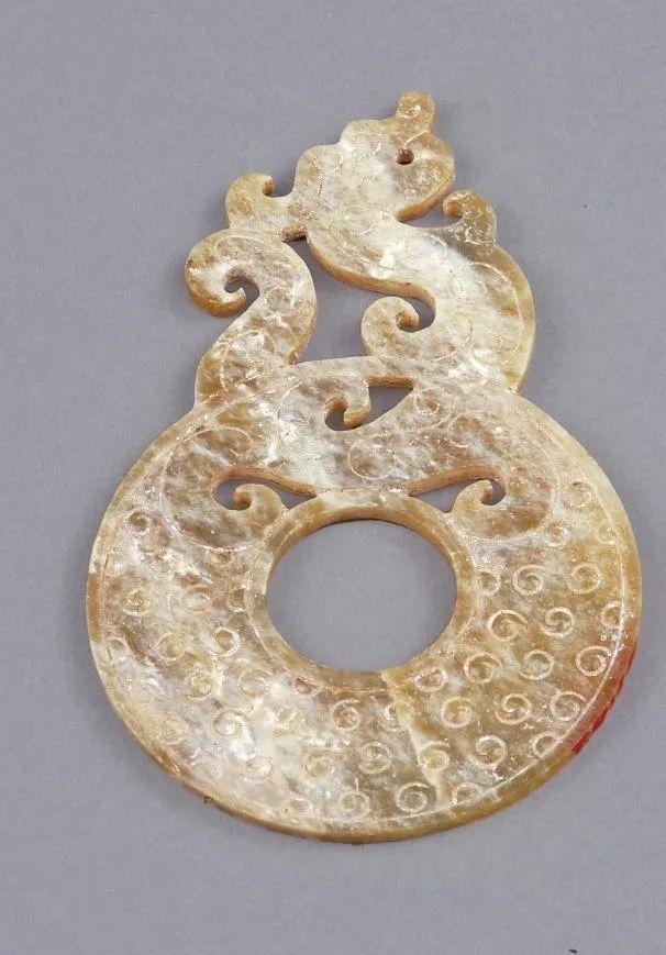 汉代镂雕龙纹璧,龙昂首,躯体屈曲,尾部上卷贴于首后,有腾空而起之势。龙形玉器表现了古人将龙融入礼器之中,希望借此上达天庭,得到神灵与祖先的庇佑。甘肃省博物馆藏。