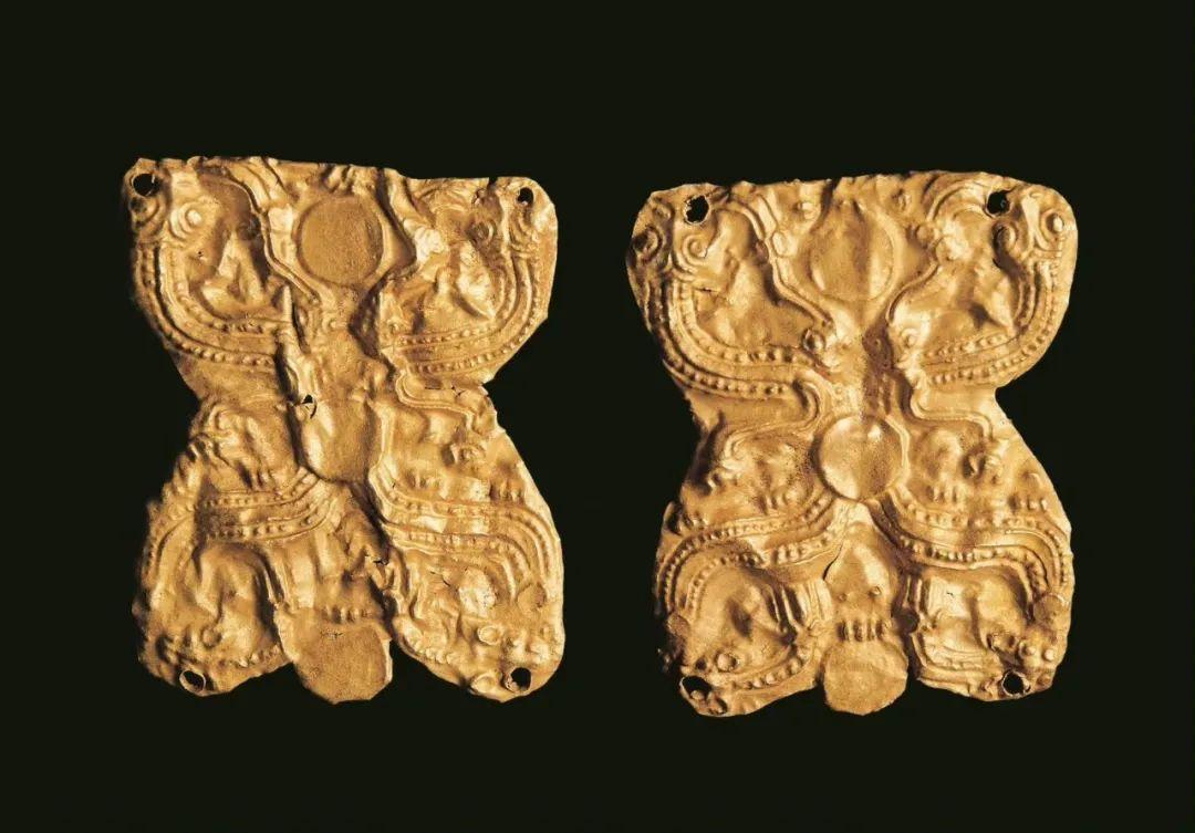 清水县刘坪出土。纵5.3—5.7厘米,横4.3—4.7厘米。系薄金片锤碟呈蝶形,两条龙交叉盘绕,龙首一侧饰两条小龙,龙首一侧饰一小虎,作咬噬龙尾状。龙身饰连珠纹,上部边缘有钉孔两个,下部边缘有钉孔一个。动物纠结的纹样源自鄂尔多斯。但龙头图案化十分明显,与中原地区的龙头表现方法基本一致。