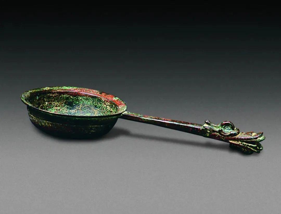 通长28厘米,柄长16厘米,勺径12厘米,铜质。分体制作,合铸而成。圆体,大口,斜平宽沿,扁圆鼓腹,圜底,方管状长直柄,柄首饰一龙首,龙双目圆睁,长嘴大开,颇有气势。熨斗内还存有黑色炭迹。现藏武威市博物馆。