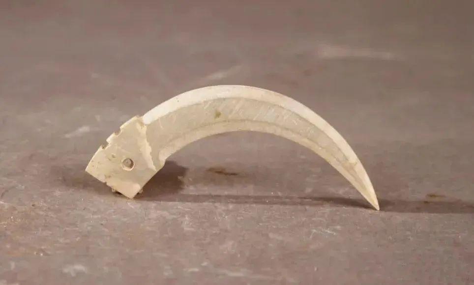 2000 年从礼县永坪乡赵坪村圆顶山 M4 墓中发掘出土。长 4.6 厘米,最宽 0.8 厘米。青玉料,灰褐色。琢磨成形,工整精致。圆弧形扁平体, 较薄。觹首呈龙首形,略凸起。龙首斜方,微张口,圆形穿孔为睛,首后凸出扉状饰。觹体如弯牙,尾端尖利,两侧磨成斜面。初为解绳结之器,演变为佩饰品,后作葬殓用玉。现藏礼县博物馆。