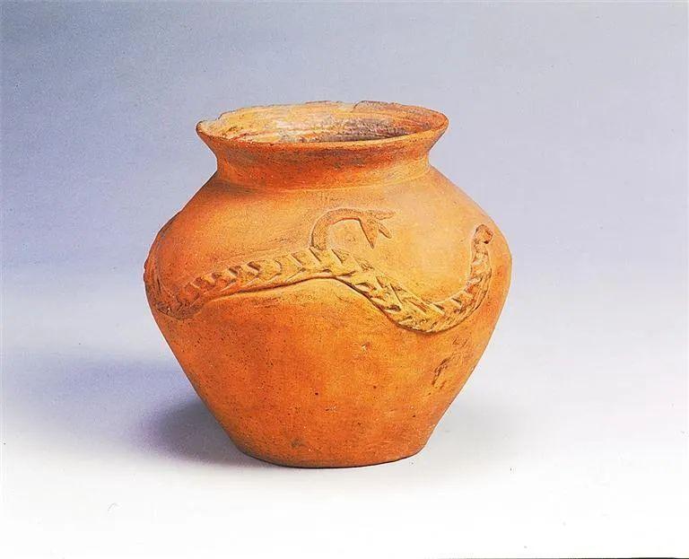 出土于甘肃广河县齐家坪的齐家文化的凸堆龙纹红陶罐,距今约4000年,罐身上饰有一条龙纹。此龙采用凸堆手法雕塑而成,蜿蜒起伏,横陈于陶罐腹部。龙身刻有鲜明的箭矢状鳞纹,一足而三爪趾,头部如蛇。这是一种较为原始的龙的造型,其体态特征尚可看出由蛇形演化而出的踪迹,这条红陶罐上的龙就西北地区而言是“资格”最老的,有“西北第一龙”美誉。