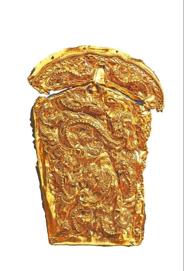 东汉金掐丝焊珠蟠螭纹带扣,在三层边饰组成的边框内是七龙纹图案,1条大龙穿梭于行云之中,其余6条小龙围绕于周边。所有龙纹先掐金丝做出轮廓,然后用颗粒较大的金珠沿中脊金线焊接形成连珠纹“龙脊”,再用颗粒较小的“金粟”填充龙身。在龙纹之间,饰流线状云气纹,繁复华美。天水市博物馆收藏。