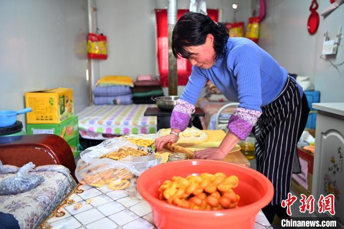 2月8日,甘肃省临夏州积石山县,民众逛集市、买年货、做美食,迎接中国农历新年的到来。图为积石山县石塬镇肖红坪村村民在安置板房内炸麻花。九美旦增 摄