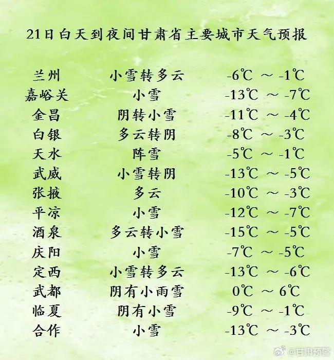 2月21日-2月22日,河西五市多云间阴,部分地方有小雪;省内其余地方阴有小雪(雨)或雨夹雪,其中甘南、定西、平凉、庆阳等州市局部地方有中雪。