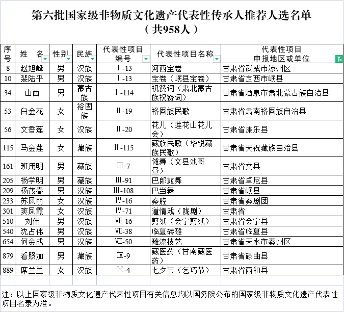 2月19日,文化和旅游部公示了第六批国家级非物质文化遗产代表性传承人推荐人选名单。此次公示的名单共计有958人,甘肃省入选16人。