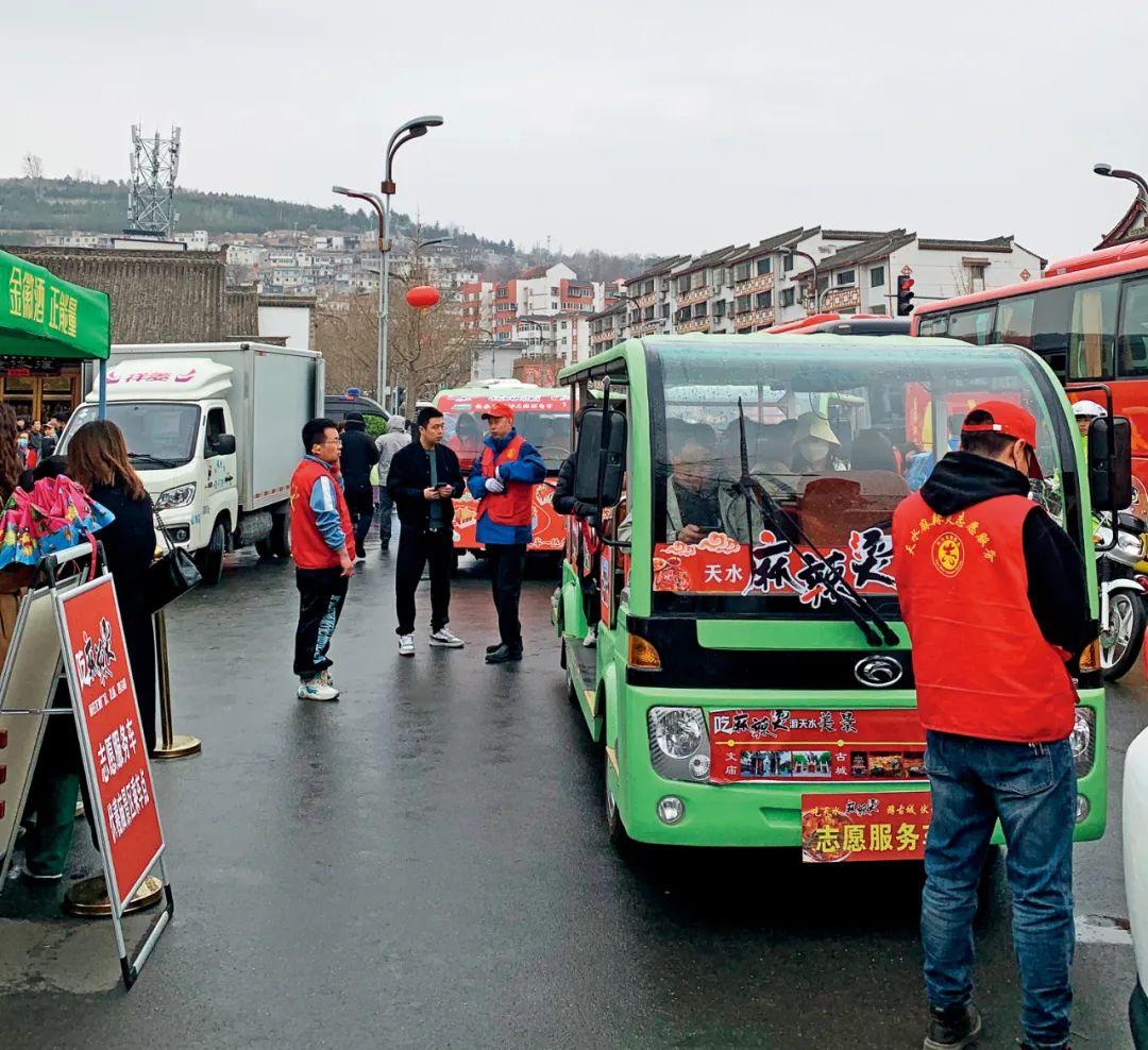 距离舞台不远处,秦州区藉河风情线管理处党支部书记晁忠年守在免费城市观光车的上车点。为了分流四合院附近密集的人群,也为了让天水更立体地将自己展示给外地游客,政府调用了藉河风情线管理处仅有的6辆观光车,观光路线经文庙、西关古城到伏羲庙。观光车“人换车不停”,从早上8点半到晚上7点,满负荷运行,每天摆渡游客4000名。