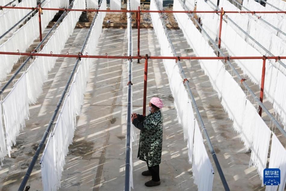 3月27日,工人在甘肃省定西市安定区凤翔镇的一家“定西宽粉”加工企业晾晒宽粉。新华社发(王克贤 摄)