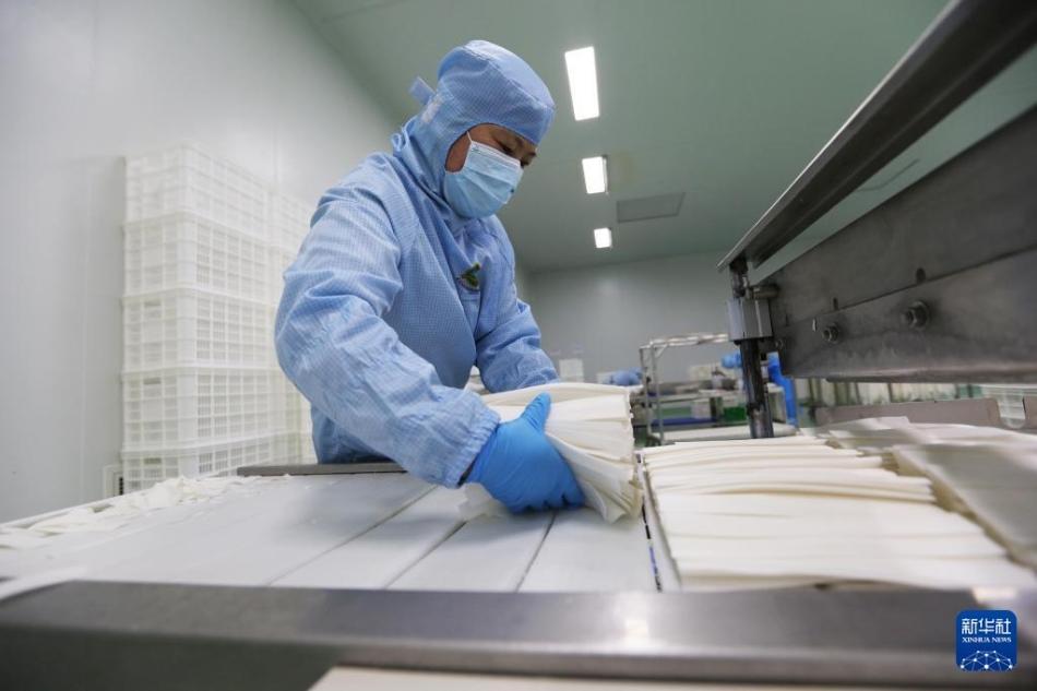 3月26日,工人在甘肃省定西市安定区巉口镇的一家“定西宽粉”加工企业的生产车间内切割宽粉。新华社发(王克贤 摄)