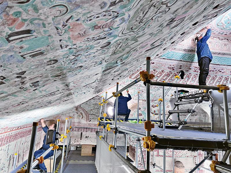 党的二十大报告提出,要加大文物和文化遗产保护力度。文物不可再生,“保护第一”是新时代文物工作的首要遵循。敦煌研究院探索多种创新手段,实现了从被动的抢救性保护到主动的预防性保护。图为2024年拍摄的莫高窟第55窟文物修复现场。 敦煌研究院供图